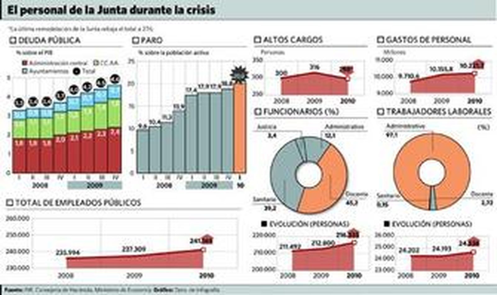 Progresa también la otra pata de la Junta: el personal laboral suma 24.536 efectivos este curso frente a los 24.193 de 2009 y los 24.202 de 2008. La combinación de unos y otros -funcionarios y contratados- disipa las dudas: un ejército de 241.169 trabajadores (5.175 más que 24 meses atrás; el más grande de la España plural) aparentemente ajeno a las penurias del mercado laboral, donde crear empleo es hoy por hoy una quimera y donde la tasa de paro (20,05% conforme a la EPA del primer trimestre) avanza sin miedo hacia listones más propios de la década de los noventa. Quimera seguirá siendo una buena temporada, ya que los expertos asumen unánimemente la regla de que sólo se fabrican puestos de trabajo con crecimientos del PIB del entorno del 2% anual. España cerrará 2010 con una contracción del 0,4% según Bruselas y del 0,3% según el Gobierno de José Luis Rodríguez Zapatero. 2011, el año cero de la recuperación, no dará para un homenaje. La Comisión Europea le adjudica al PIB nacional un alza del 0,8% y Moncloa, más optimista por defecto, un 1,8%.