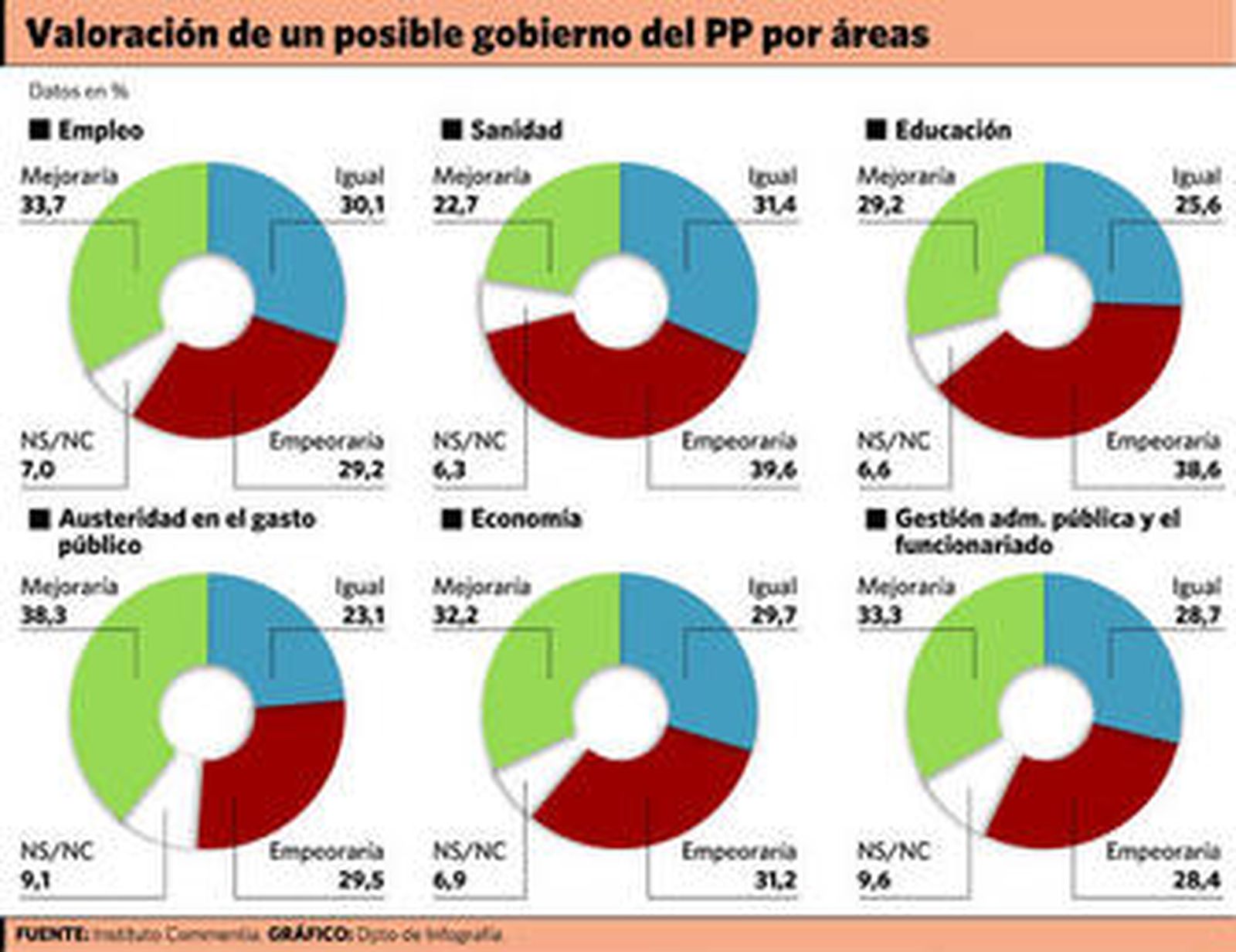 Las pistas ofrecidas por los populares desde la centralita de Madrid pero, sobre todo, vía comunidades como Valencia, refuerzan entre los encuestados la sospecha de que Andalucía no escapará al tijeretazo. Sanidad y Educación, dos de las patas más sensibles del Estado de bienestar y uno de los termómetros más fiables de la política social de un gobierno, sufrirán recortes según la impresión predominante. En junio de 2010 la confianza en el PP andaluz era, incluso en este ámbito, la norma. Ahora es la excepción: el 39,6% apuesta por unos servicios sanitarios devaluados frente al 22,7% que vaticina una mejora; mientras que un 38,6% teme un sistema educativo a la baja ante el 29,2% que piensa al revés.