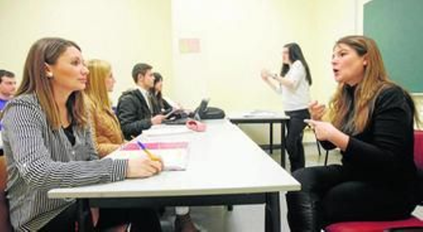 Arabia Serrano atiende en clase a las explicaciones que le da su intérprete de signos, Azahara Naranjo.