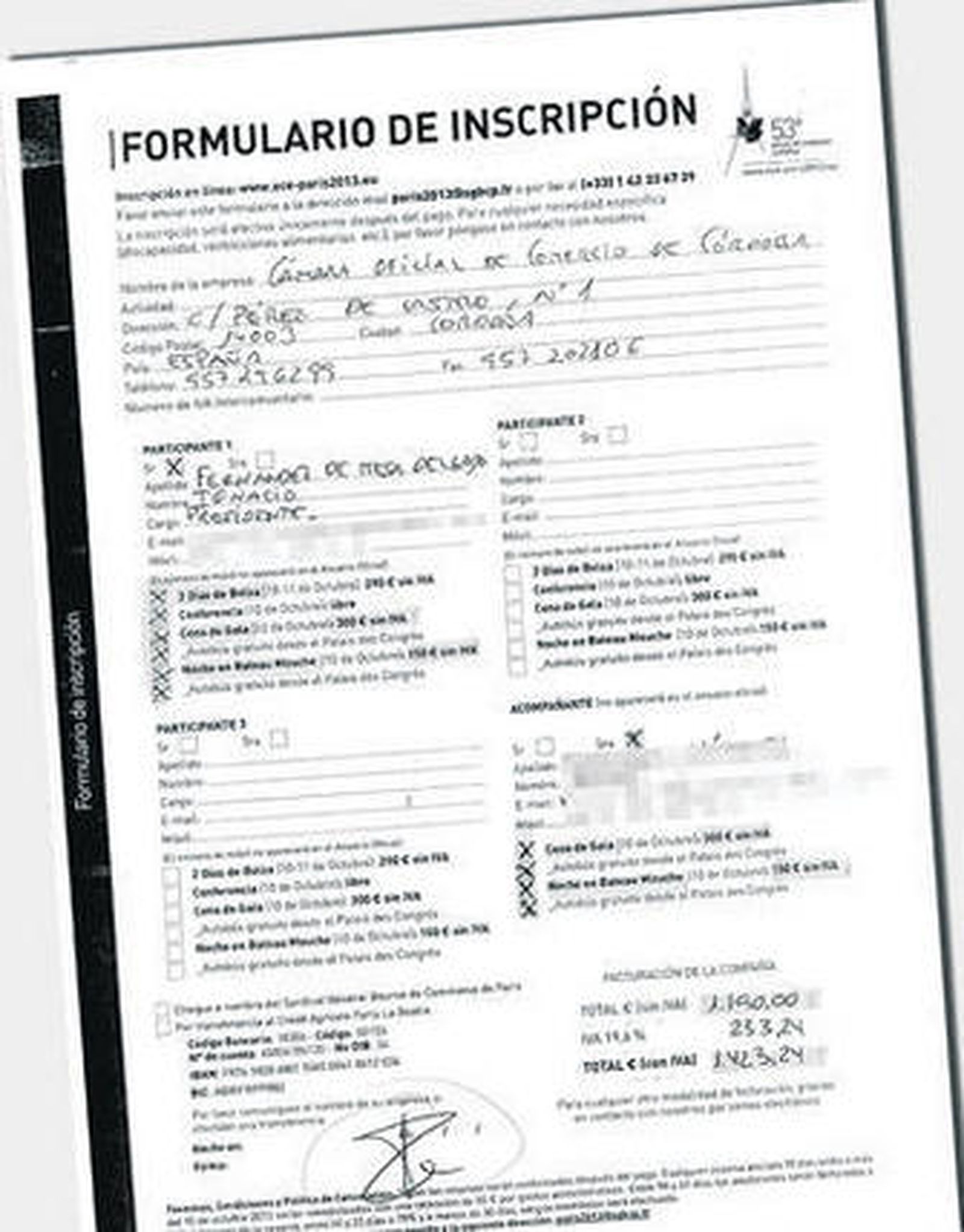 Pero además de esta abultada factura telefónica, el presidente de la entidad aprovechó uno de sus viajes a Francia para cargar a la Cámara una serie de gastos de su acompañante en ese viaje, concretamente su esposa. La cita está ligada a un encuentro europeo de lonjas y en el formulario previo Fernández de Mesa señala que le acompañará su esposa, para la que reserva una cena de gala valorada en 300 euros y una noche en el Bateau Mouche que costó 150 euros, además de autobús gratuito de desplazamiento desde el palacio de congresos en el que se celebraba esta reunión. El total de la facturación es de 1.423 euros, de los que aproximadamente la mitad corresponden a gastos realizado por la esposa del presidente y que cargó a a la Cámara.