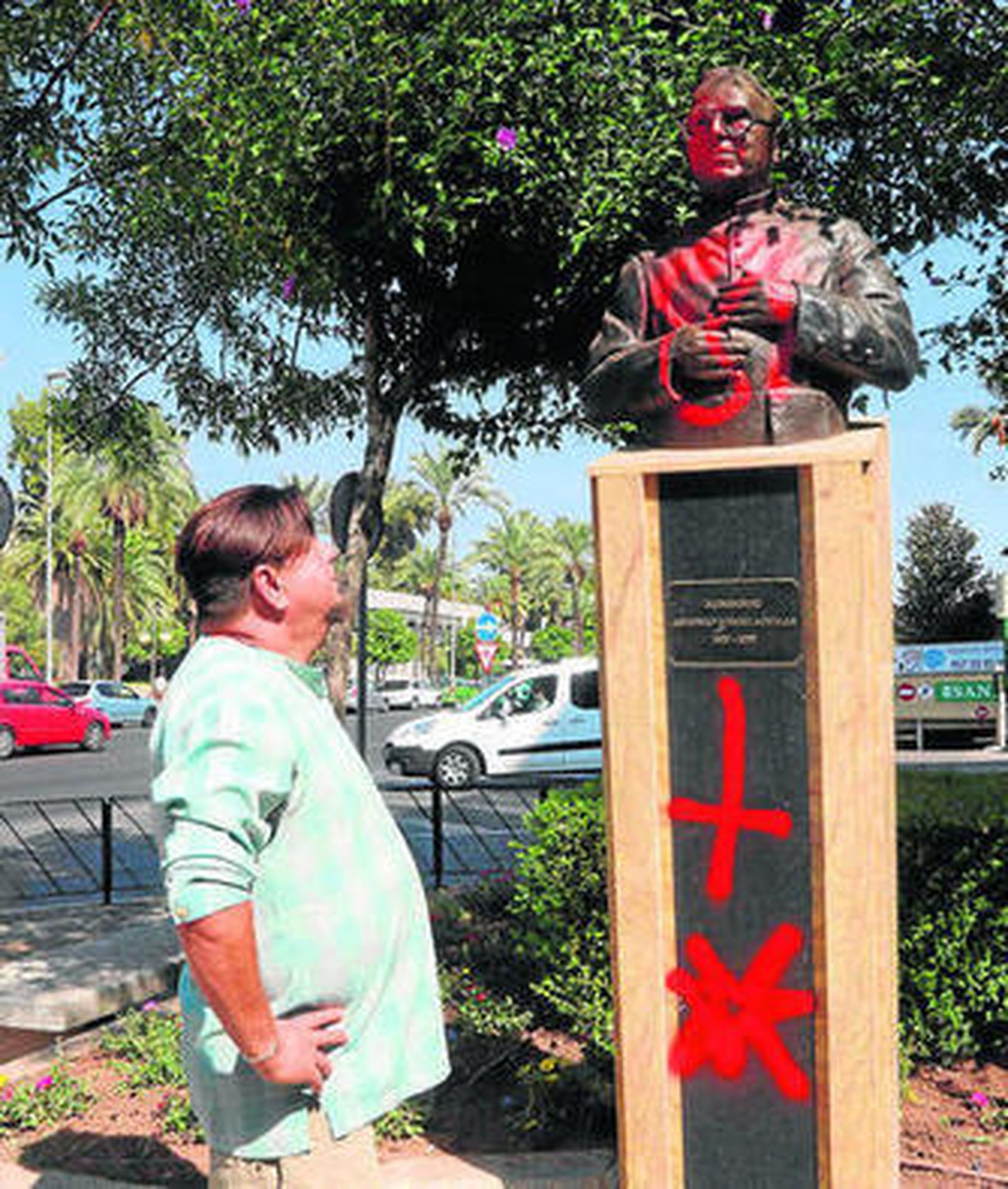 Los actos vandálicos contra el patrimonio urbano continúan en Córdoba y ayer la escultura dedicada al fundador de la Obra Pía de la Trinidad, Antonio Gómez Aguilar, amaneció con una nueva pintada, la segunda desde que el busto se inaugurase el pasado mes de marzo. En concreto, la escultura, que se encuentra instalada en la esquina de la avenida de La Victoria con Lope de Hoces y obra de José Manuel Belmonte, apareció con una cruz invertida pintada con spray rojo.
