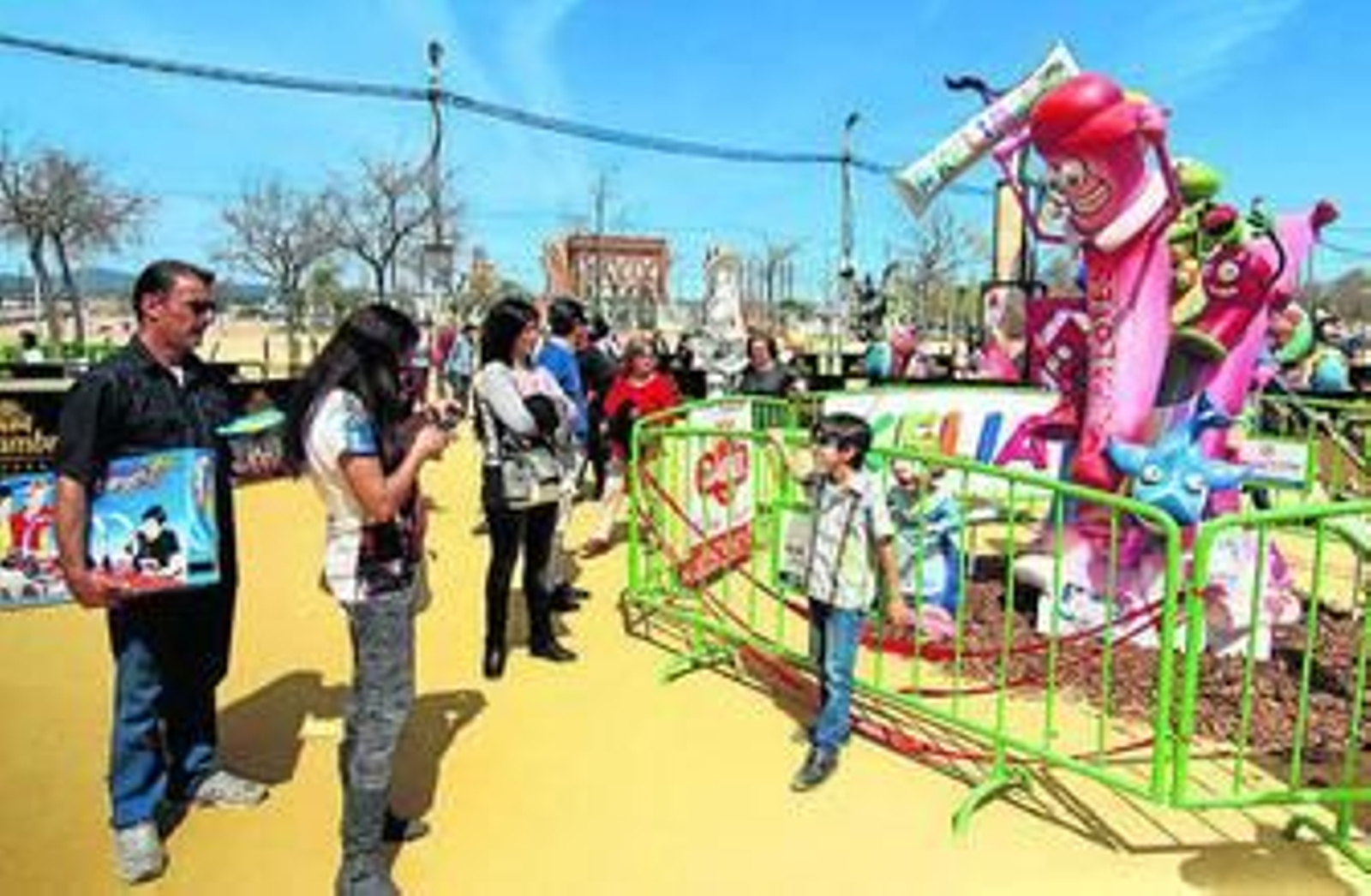 "Mira, si parece Shreck". Le comenta un padre a su hijo señalando, cerveza en mano y plato de paella en otro, a un ninot regordete con forma de bandolero que forma parte del monumento fallero más grande de los tres que este fin de semana han convertido a El Arenal en una pequeña sucursal de Valencia. Muy cerca de ese bandolero, casi a sus pies, hay un pequeño cartel que recuerda que "hemos venido a mostrar lo mejor de nuestras tradiciones; esperemos que les guste mucho y nos visiten en tradiciones". Es tan sólo uno de los muchos carteles que ha colocado la asociación Fallers pel mon (Falleros por el mundo) tanto en ese monumento que preside un gran ninot tallado en árabe y que, según el presidente del colectivo, José Enrique Amores, simboliza una mezcla de las culturas valenciana y andaluza, como en el infantil, una macedonia de chucherías presidida por un gran palote. Junto al monumento fallero más grande, L, Estoreta Velleta, "un monumento que es el origen de las fallas, compuesto cosas viejas que iba entregando la gente y que se iban apilando y quemando simbolizando que se quemaba lo viejo para dar paso a lo nuevo", detalla Amores. En L, Estoreta Velleta hay marcos de cuadros, viejos muebles, sillas viejas...