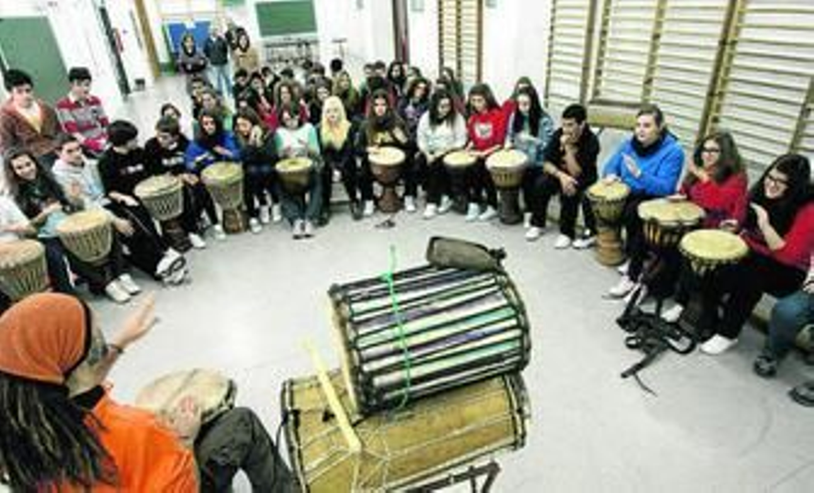 La actividad comenzó con una introducción al lenguaje musical, ritmos y melodías africanas, y los estudiantes participaron activamente cantando y tocando instrumentos de percusión africanos como el djembe y el dum-dum, que se percuten con un palo llegando a obtenerse tres tipos de sonido. María y Ana, alumnas del centro, comentaron que el taller había sido muy entretenido y "deberían repetirlo más a menudo".