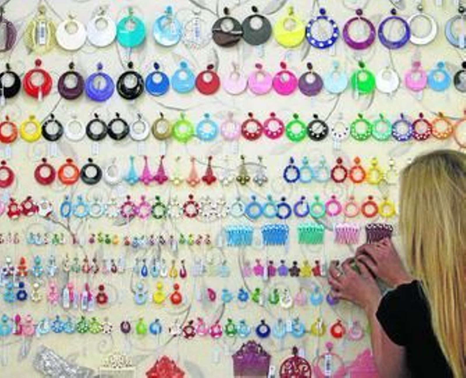 Otros de los imprescindibles este año vuelven a ser los mantones. Los de encaje de bolillos están triunfando desde hace varias temporadas, aunque por su elaboración a mano suelen ser más caros. También se vuelven a llevar los maxi flecos que salen desde el cuello y, como novedad, unos artesanales realizados a partir de un punto parecido al croché que vienen desde Brasil. A todo esto hay que sumar los collares y las pulseras, porque una flamenca nunca parecerá recargada aunque utilice todos los complementos a la vez, pues forma parte de la indumentaria. En este apartado, los tradicionales de cuentas de colores siempre valen, de cualquier tamaño y color, y combinado a modo de gargantilla o dejándolo caer sobre el vestido. Los brazaletes se suelen buscar teniendo en cuenta el color de vestido, aunque desde hace varias temporadas, todo vale. Las cordobesas están pidiendo sobre todo el coral y el verde agua que, precisamente, coinciden con los tonos de la temporada en la moda en general. Se acaba el tiempo para conseguir los mejores complementos que dan el detalle final para lucir perfecta sobre el albero de El Arenal.