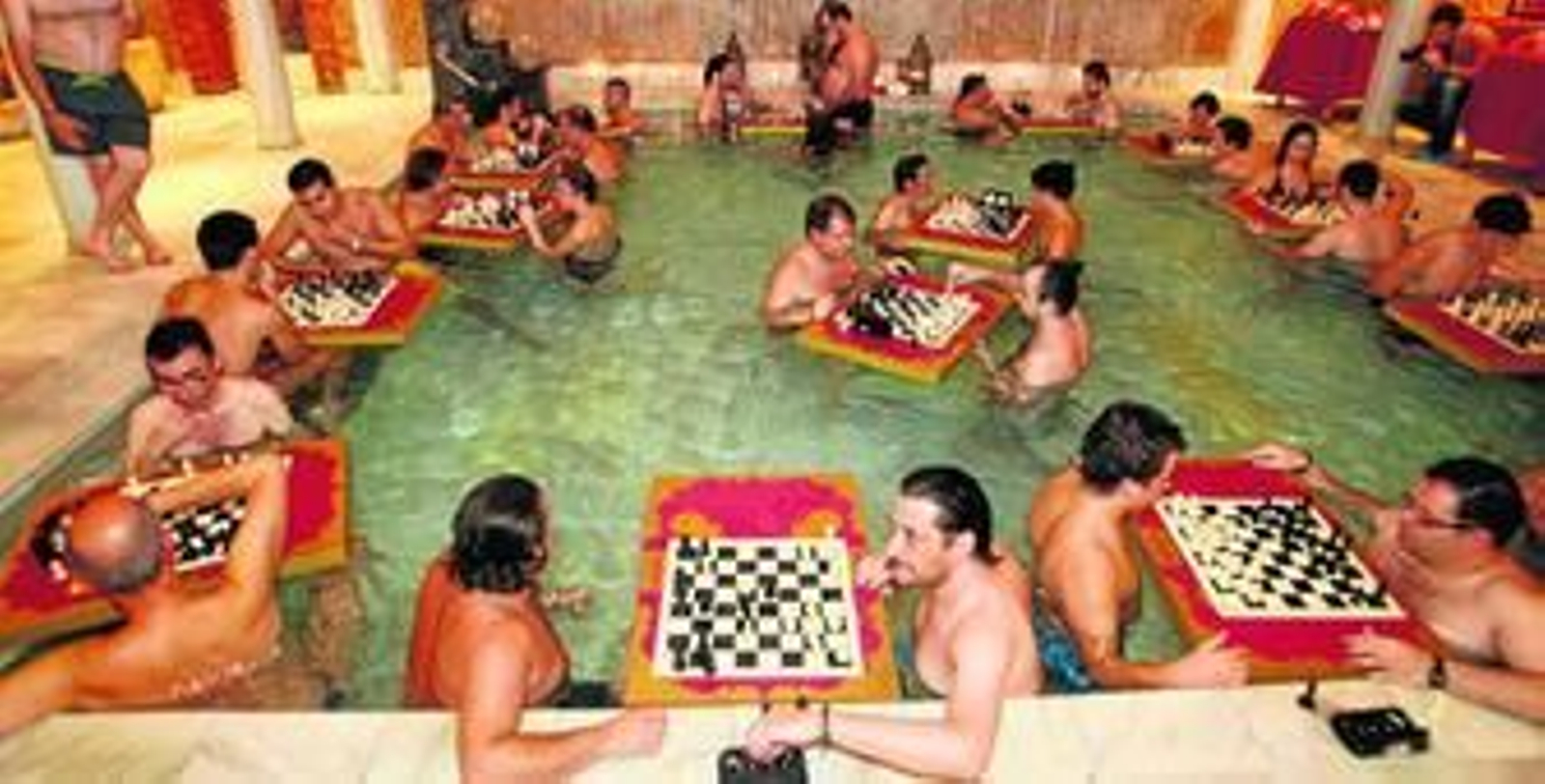 Hammam o baño árabe era en tiempos de Al Ándalus, además de un lugar para la higiene y el acicalamiento, un espacio preparado para el encuentro social, donde se hacían negocios, se cerraban tratos, se conversaba, se leía y se practicaba el ajedrez, ya que, según muchos historiadores, este juego táctico fue introducido por los árabes en la península ibérica, en el siglo VIII. Y ayer, como si el tiempo no hubiese avanzado, los Baños Árabes acogieron una de las fases eliminatorias de un torneo acuático en el que un total de 40 jugadores pudieron demostrar su destreza moviendo sobre el tablero los peones, la torre y el rey para abatir al contrincante.