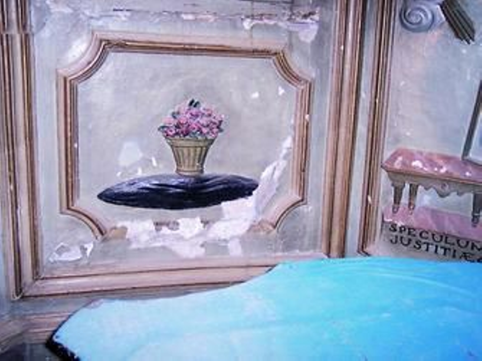 Estas grietas son también visibles desde el interior. En la nave del templo llama la atención la grieta del arco toral, que es el que sustenta el peso de la cúpula. Además, hay otras fisuras tanto en la bóveda como en el presbiterio, así como en el coro. Poco a poco se está también desprendiendo el revestimiento de los muros exteriores, lo que deja al aire el mortero que sufre la erosión tanto por los cambios de temperatura como por la acción directa del agua o del viento.