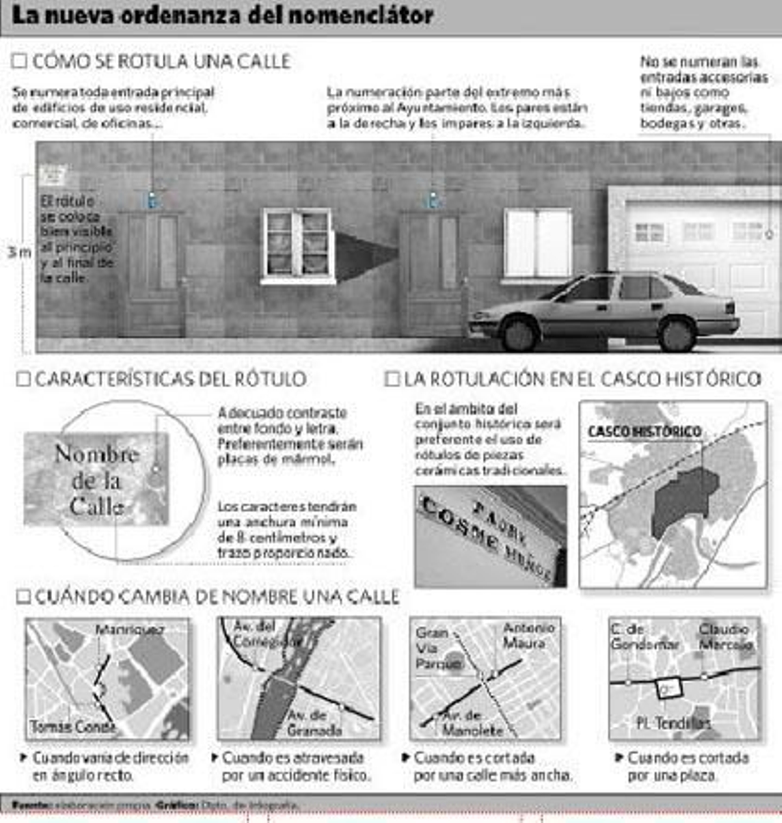 La nueva normativa recuerda que los cambios en las denominaciones serán excepcionales por los perjuicios que conlleva a los vecinos. Además, establece que las calles mantengan sus nombres históricos así como las zonas de nueva creación, que se rotulen con las topónimos del predio que ocupan. Se podrían evitar también casos como el de la Carrera del Caballo, cuyas calles han recibido el nombre de cantantes, sin que se quede constancia alguna de los nombres que tradicionalmente se han utilizado para esta zona de la periferia.