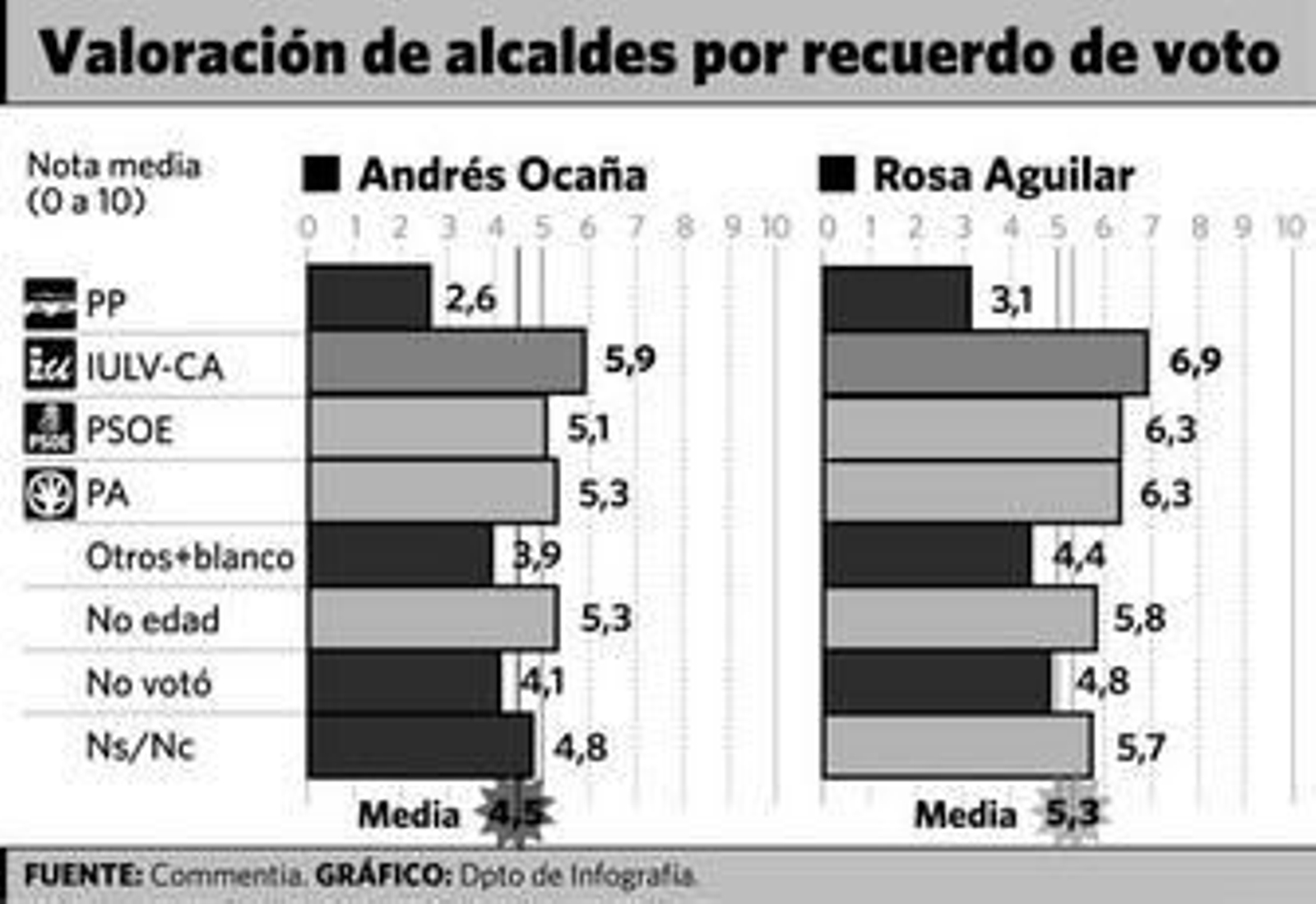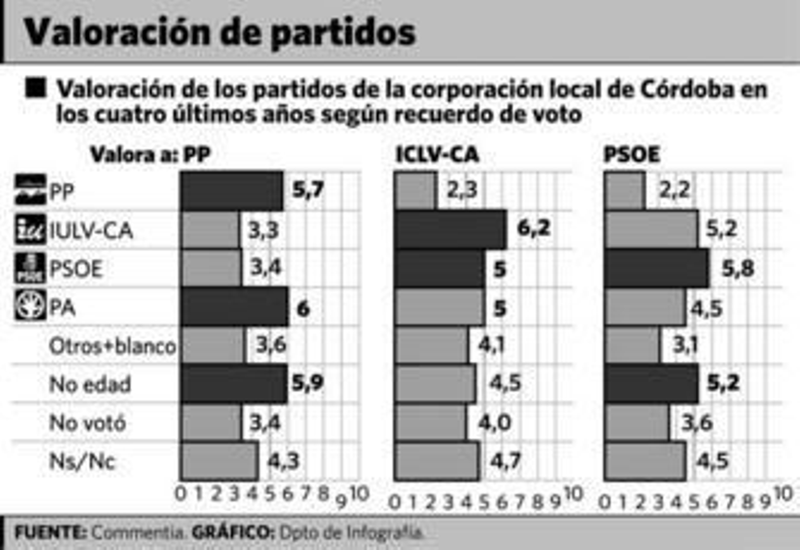 Curiosamente, el PP no consigue mejor puntuación porque sus votantes de 2007 consideren que lo ha hecho muy bien sino porque quien votó a Izquierda Unida y al PSOE le da una puntuación menos baja que la que el electorado popular le asigna a los dos partidos que conforman el gobierno de coalición. Los más conformes con el trabajo de su partido político son los votantes de Izquierda Unida, quienes le dan un 6,2 al grupo municipal que han dirigido Andrés Ocaña y Francisco Tejada. Le siguen los votantes populares, a quienes su electorado le otorga un 5,7 al trabajo de su partido político durante los últimos cuatro años. El electorado socialista de hace cuatro años aprueba por los pelos a los suyos con un 5,2.