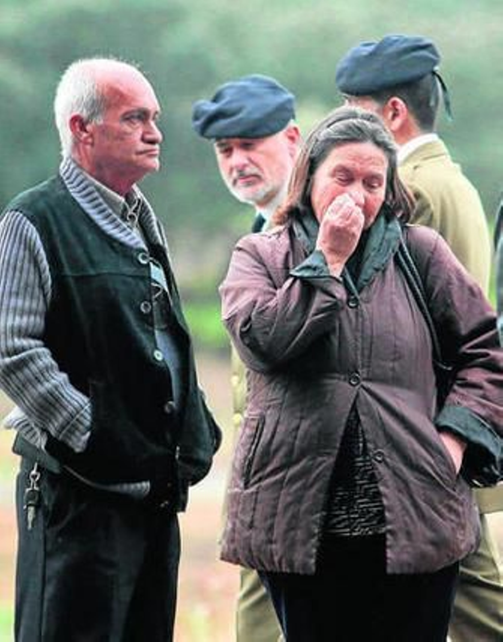 Seis soldados se encargaron de plegar la bandera de España puesta a modo de sudario sobre el féretro. Uno de los soldados le hizo entrega a la esposa del cabo Soria, Laura, de la enseña, junto con la condecoración impuesta por el ministro de Defensa y la prenda de cabeza del casco azul. La viuda no pudo reprimir su dolor. Nada ni nadie podía consolar su pena ante la pérdida de su pareja y futuro padre de la hija que está a punto de nacer.