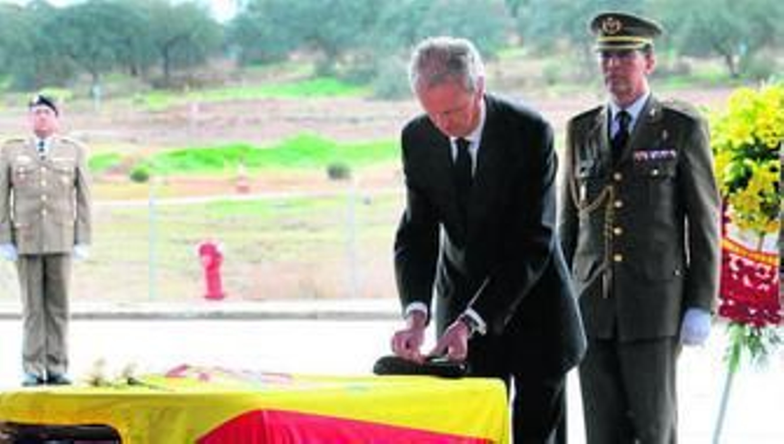 El féretro del cabo Soria fue depositado en el túmulo situado en el hangar de la base, mientras la banda de música interpretaba la primera de las dos marchas fúnebres que sonaron durante el solemne acto. El ministro de Defensa procedió a la imposición sobre el féretro de la Cruz del Mérito Militar con distintivo rojo. Ésta es la máxima distinción, al haber fallecido en acto de servicio y reunir las condiciones por su trayectoria en las Fuerzas Armadas y su servicio en el Líbano, donde se ha desplegado en dos ocasiones. Tras este momento, los presentes escucharon el himno de España y la Unidad de Honores disparó una salva de fusilería.