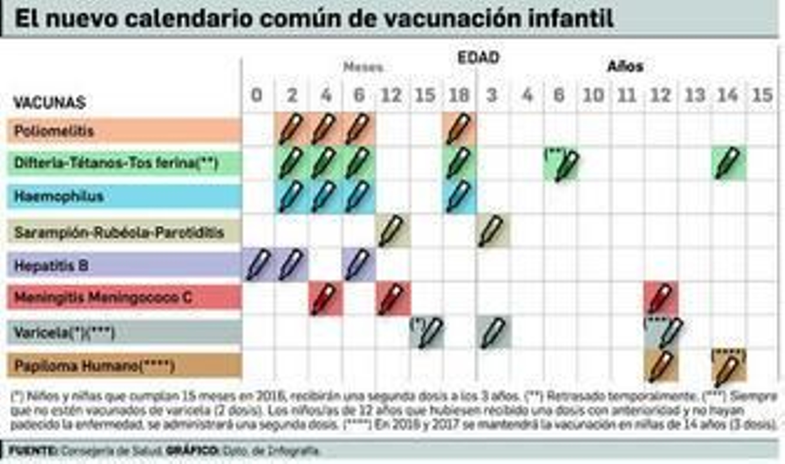 La vacuna de la varicela se admistrará en la primera infancia, con dos dosis, a los 15 meses y a los tres años, a partir del próximo lunes, 15 de febrero. El calendario oficial de vacunación de este año incluye otro adelanto: la vacuna del virus del papiloma humano, que hasta ahora se administraba a las niñas a los 14 años, se adelanta a los 12 años.
