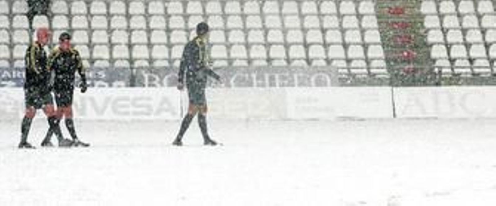 Los futbolistas de ambos conjuntos y el trío arbitral salieron a calentar. Sin embargo, pronto se percataron de que la idea de jugar sobre una superficie tan resbaladiza era una temeridad. Las líneas habían sido barridas, pero seguía nevando y los empleados del Córdoba no disponían de cal roja (fue el recurso empleado en Soria el pasado sábado para que se jugara el Numancia-Betis, por ejemplo). Los espectadores siguieron entrando en el recinto y se animaron con el anuncio por megafonía de las alineaciones, pero todo fue un espejismo.