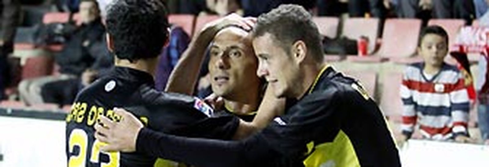 Un golpe franco de Delporte al lateral de la red y sendos centros de David de Coz y Javi Flores desde la línea de fondo fueron las primeras señales ofensivas en un estadio con muchas butacas vacías y el césped cortito y fresco, ideal para tocar por abajo. El Nàstic no estaba para muchos trotes y abusaba de las cesiones a su portero, que sacaba en largo una y otra vez. No fue hasta el cuarto de hora cuando el cuadro local combinó de banda a banda para acabar con una volea del mediocentro Miki a centro del lateral Mingo. Un alarde de los chicos de Luis César, ese entrenador de traje impoluto, calva reluciente y estilo vistoso pero poco rentable.