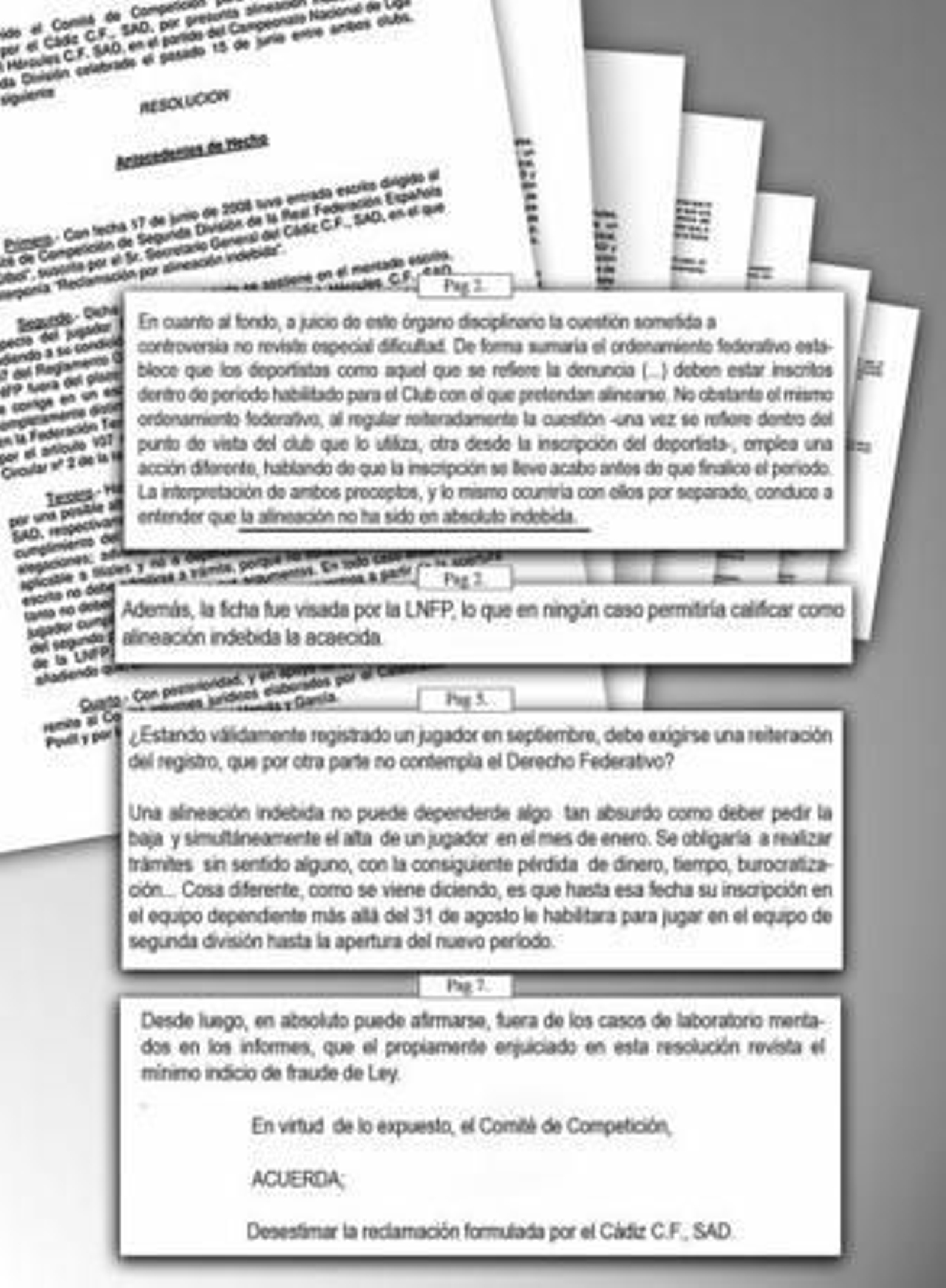En este particular, la resolución federativa se apoya en la jurisprudencia anterior, como el caso Messi -los clubes que se enfrentaban al Barça impugnaban sistemáticamente la alineación del argentino cuando saltó desde el juvenil blaugrana al primer equipo- y las denuncias contra futbolistas del Real Murcia en temporadas recientes, que fueron resueltas con el mismo argumento. "Concedida la licencia por el organismo competente y para esa competición en concreto (…) se podrá discutir su validez, impugnar ante la autoridad competente, etc., pero no sancionar por alineación indebida".