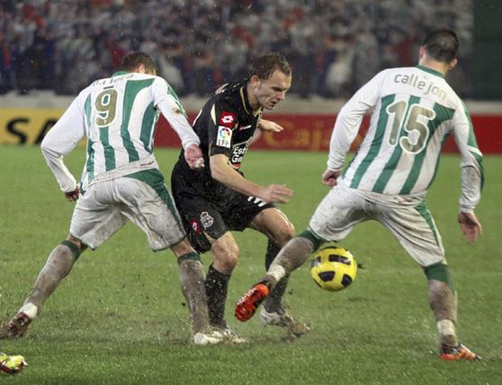 El diluvio ya tenía el campo como contra el Valladolid. Una barbaridad. El Córdoba siguió achuchando y la zaga deportivista dudaba. Bajo la segunda mojada de campeonato, sólo tres días después de la original, el combinado gallego no parecía gallego. Los jabatos de Lucas se sentían más cómodos. Y el técnico dio una vuelta de tuerca con Oriol Riera, otro delantero, en detrimento de Luque. Usero retrocedió unos metros.