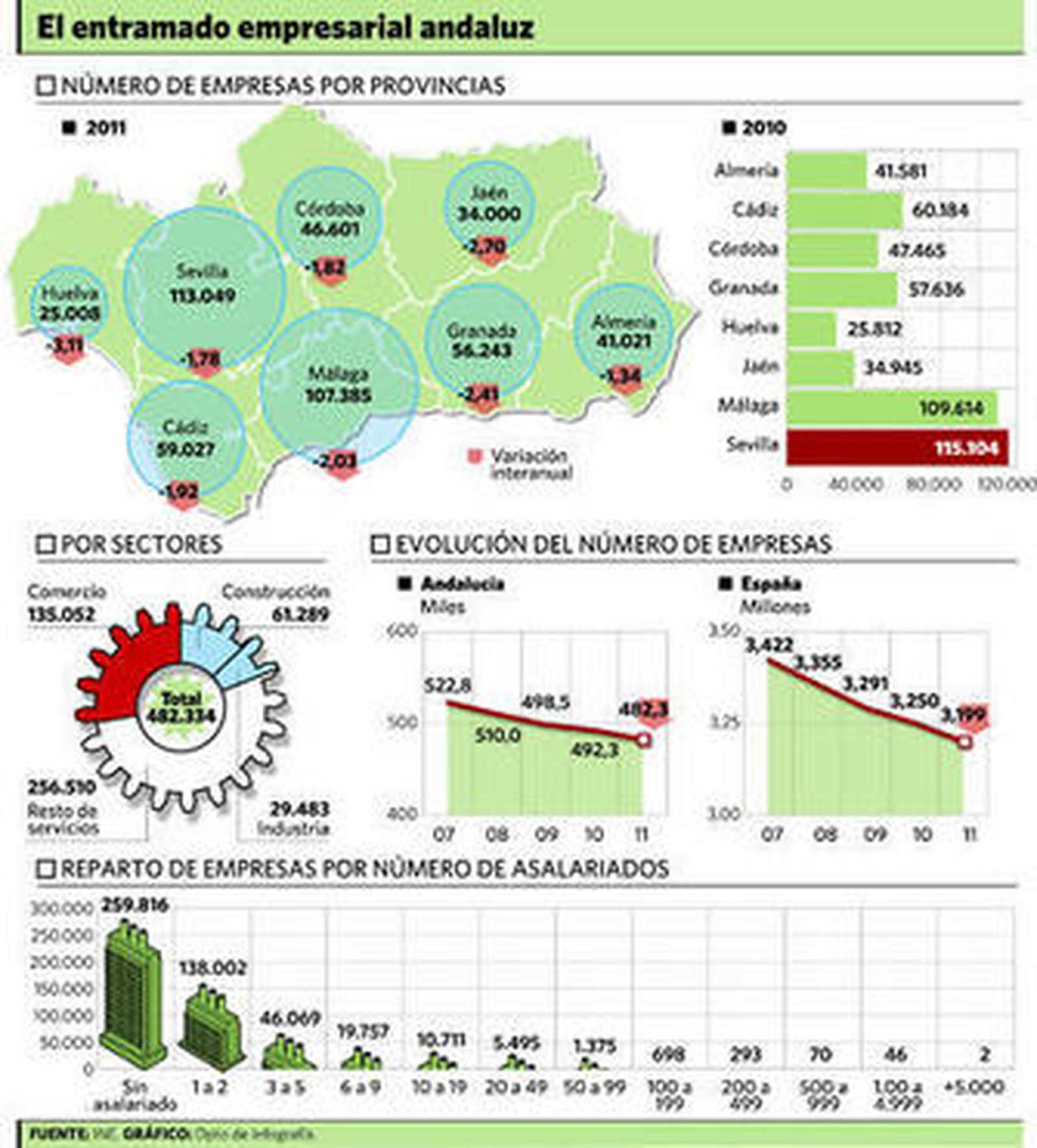 Comparativamente, el tejido productivo andaluz se resintió más que el nacional en 2011: la comunidad perdió un 2,03% de enseñas, hasta las mencionadas 482.334, frente al recorte del 1,6% español, que dejó el panorama en 3,19 millones de compañías.