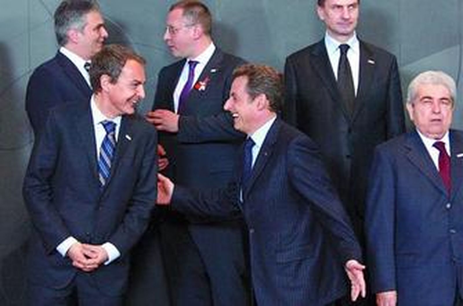 l El presidente francés, Nicolás Sarkozy, saluda al jefe de gobierno español, José Luis Rodríguez Zapatero, durante el posado para la foto de familia de la reunión informal de líderes de la Unión Europea que se ha celebrado este fin de semana en Bruselas. La crisis económica centró el encuentro, planteándose medidas para aliviar la situación de los mercados financieros. Se recalcó "la importancia de la estabilidad macrofinanciera en toda la Unión Europea", pero negó que Europa central y oriental sea una región necesitada de planes especiales a pesar de su delicada situación financiera. La cumbre confirmó que la ayuda a los bancos matrices en países del Oeste de la UE "no debe suponer ningún tipo de restricciones para las actividades de las filiales" en otros estados de Europa central y del este.