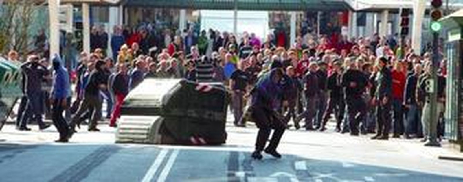 Los radicales quemaron 11 contenedores y cruzaron más de 300 en las principales arterias de la capital vizcaína mientras las cargas policiales se sucedían para atajar una marea de altercados que se saldaron con cinco detenidos, un agente de la Ertzaintza herido leve y dos mujeres golpeadas. A este negativo balance se sumaron las roturas de numerosos cristales y el cruce de autobúses.