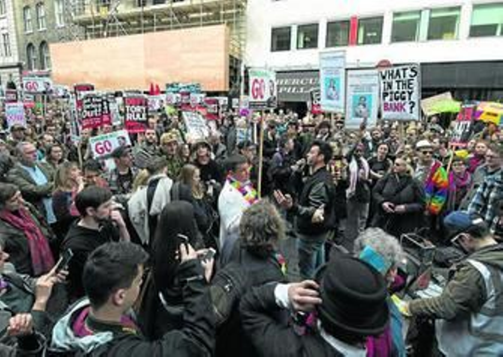 "Cameron se tiene que marchar", "No te creemos más. Dimite Cameron" o "Lo que pasa en Panamá no se queda en Panamá" fueron algunos de los carteles que portaron los asistentes a la protesta mientras proferían gritos de "fuera, fuera Cameron". Uno de los manifestantes desplegó un cerdo de cartón, pintado de rosa y con una foto de Cameron pegada en la nariz del muñeco, que fue colocada ante Downing Street antes de que la protesta marchase hacia un hotel del cercano barrio de Covent Garden, donde el primer ministro pronunciaba un discurso ante seguidores conservadores. Desde la calle los participantes gritaban "fuera, fuera Cameron" mientras numerosos agentes del orden mantenían un fuerte dispositivo de seguridad y tenían bloqueada la entrada al edificio.