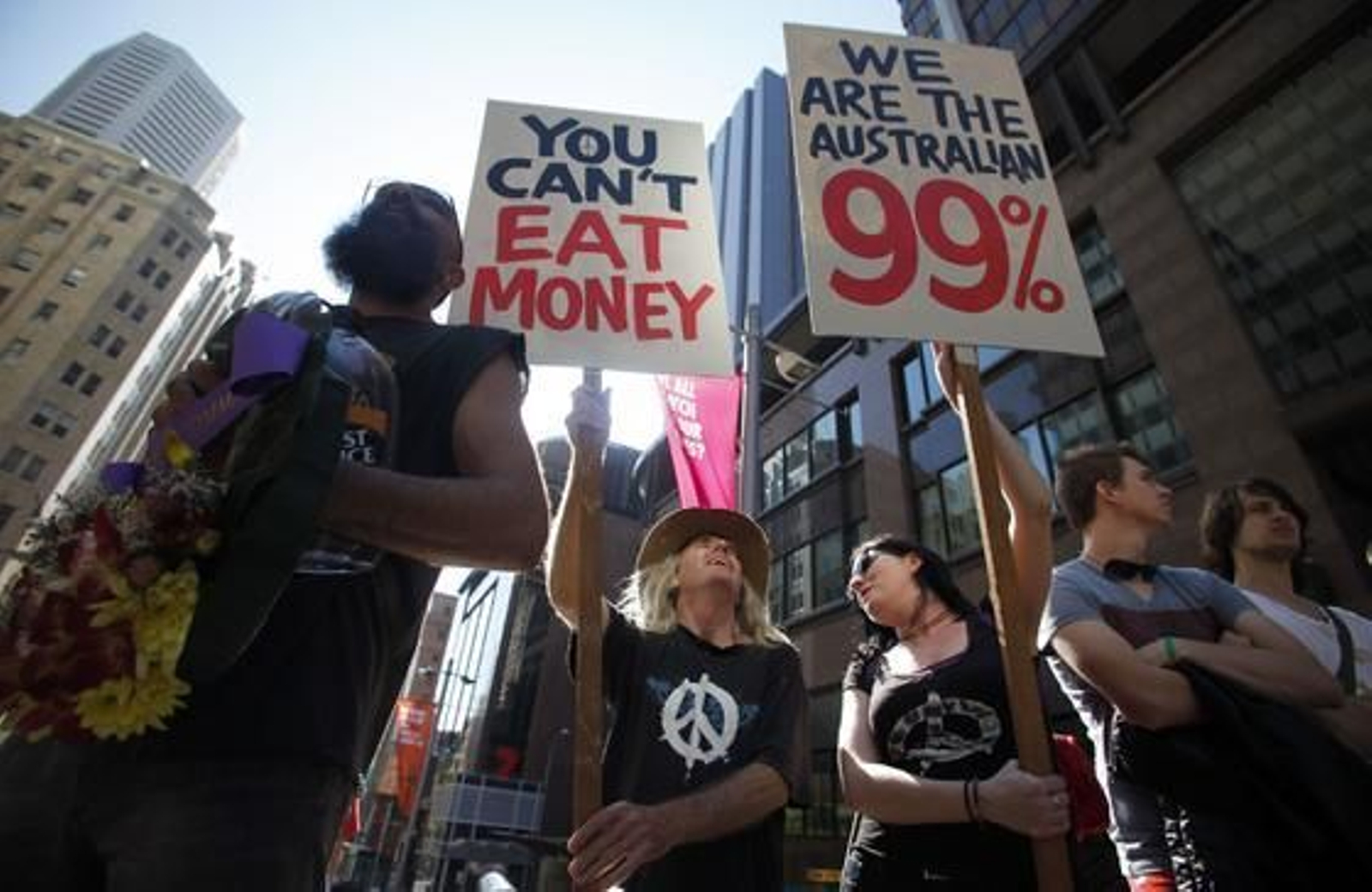 Varios centenares de indignados se manifestaron en diversas ciudades de Australia y Nueva Zelanda para exigir una "democracia real" y un "cambio global". "¡Sídney está ocupada!, la asamblea general decidió quedarse en Martin Place", rezaba un mensaje difundido en una red social del movimiento Occupy Sydney, al referirse a la calle frente a la sede del Banco de la Reserva de Australia, en el corazón financiero. Alrededor de unos 200 "indignados" de los varios cientos que asistieron a la protesta permanecían en ese lugar para pernoctar por "tiempo indefinido", dijo un portavoz del movimiento, Josh L. Los manifestantes de Sídney emulan la acción de "Occupy Wall Street" en el centro financiero de Nueva York y las concentraciones de los indignados españoles entre otras movilizaciones populares para protestar contra la crisis económica y los abusos del sector financiero. Con pancartas con mensajes como: "No hay derecha ni izquierda, solo hay tiranía o libertad", "El dinero no se come", "Pongan fin al imperialismo estadounidense", "No riegues la semilla de la avaricia", los improvisados oradores se alternaban para denunciar la avaricia de los bancos, los recortes presupuestarios, o el alto coste de vida.