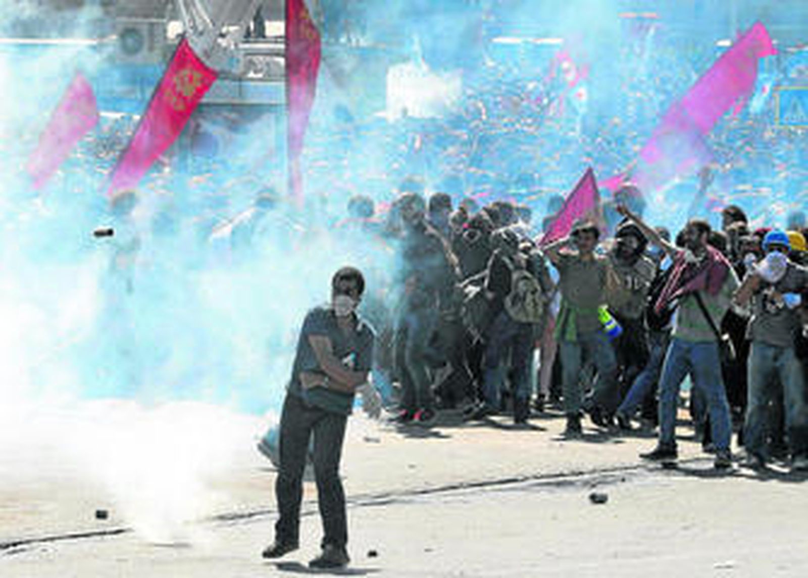 La manifestación de ayer, en la que se reprodujeron los violentos enfrentamientos del viernes, comenzó temprano en el lado asiático de la ciudad. Los participantes marcharon a pie cruzando el puente del Bósforo para llegar a la plaza Taksim, con violentos choques con la Policía a lo largo del recorrido.