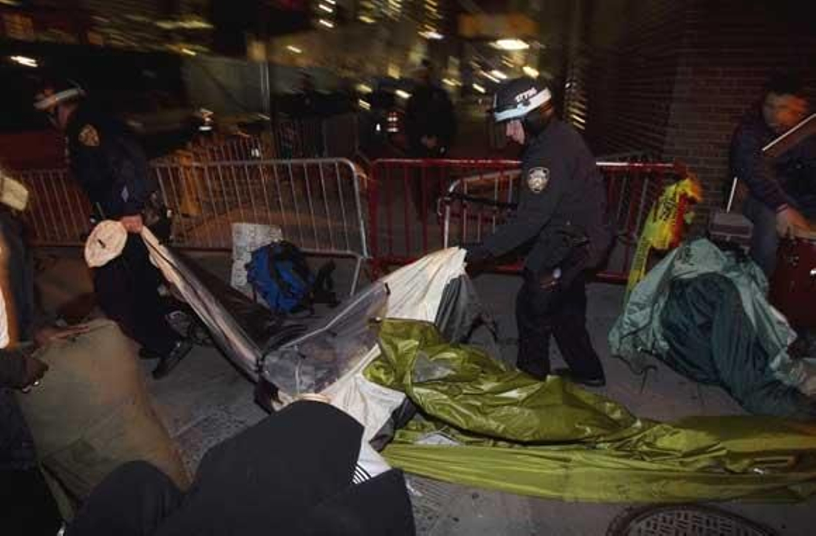 Bray detalló que la respuesta de los indignados al desalojo de su campamento dictado personalmente por el alcalde de Nueva York, Michael Bloomberg, llegó hasta los tribunales, donde la jueza Lucy Billings emitió una orden que prohibía la evacuación forzosa del lugar y permitía acampar a los manifestantes. Además, los indignados procedieron a la ocupación de un nuevo parque situado en la confluencia de las céntricas Canal Street y la Sexta Avenida, muy cerca de la entrada al túnel Holland, que une Nueva York y Nueva Jersey, y propiedad de la parroquia de Trinity Church.