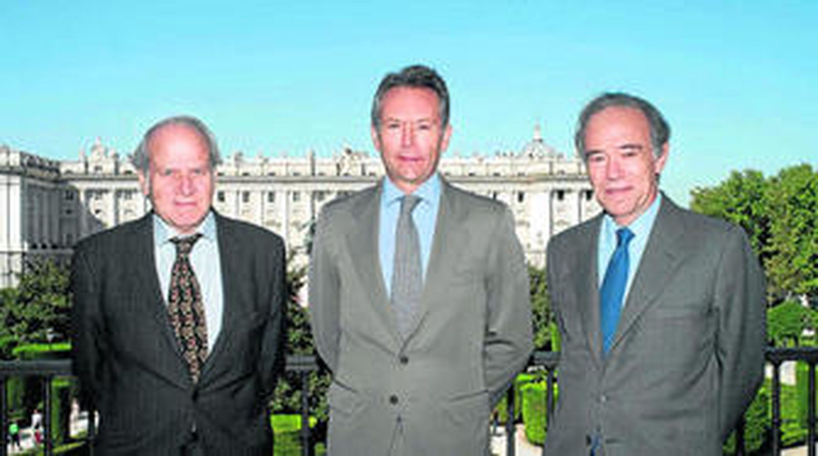 El presidente del Grupo Joly, José Joly, el presidente de la Fundación Teatro Real, Gregorio Marañón, y el director general del Teatro Real, Miguel Muñiz, firmaron ayer el acuerdo de colaboración que convierte al grupo de comunicación andaluz en nuevo patrocinador del Teatro Real.