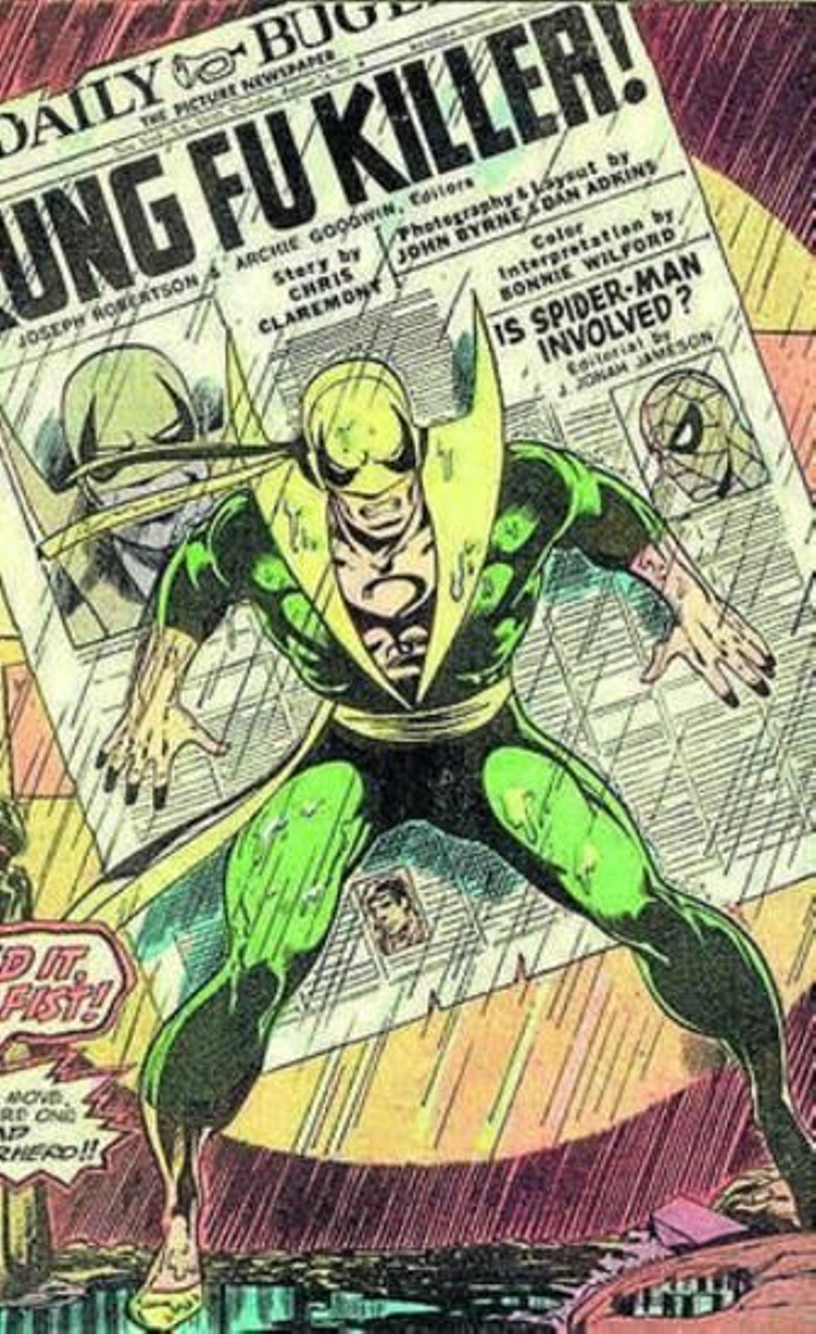 Esta imposible mezcla de kung fu, mística oriental y superhéroes fue ideada por Roy Thomas y puesta en imágenes por Gil Kane en el número 15 de Marvel Premiere (mayo, 1974). Dicha serie albergó durante año y medio las aventuras de Danny Rand, alias Puño de Hierro, de la mano de los escritores habituales de la época: Len Wein, Doug Moench, Tony Isabella y Chris Claremont. El apartado gráfico, por su parte, incluyó nombres menos habituales: Dick Giordano, Larry Hama, Arvell Jones, Pat Broderick y un incipiente John Byrne. La feliz reunión de Claremont y Byrne, justo antes de que el personaje adquiriese cabecera propia en noviembre de 1975, produjo una ristra de historietas irrepetibles, de esas que merecen figurar en la biblioteca de cualquier aficionado al género. El dúo firmó los estupendos episodios de Iron Fist hasta su cancelación en el número 15 (septiembre, 1977, con la significativa presencia de La Patrulla-X), y retomó al personaje primero en un par de tebeos de Marvel Team-Up y luego en la serie Power Man que, desde su número 50 (abril de 1978), pasó a llamarse Power Man & Iron Fist.