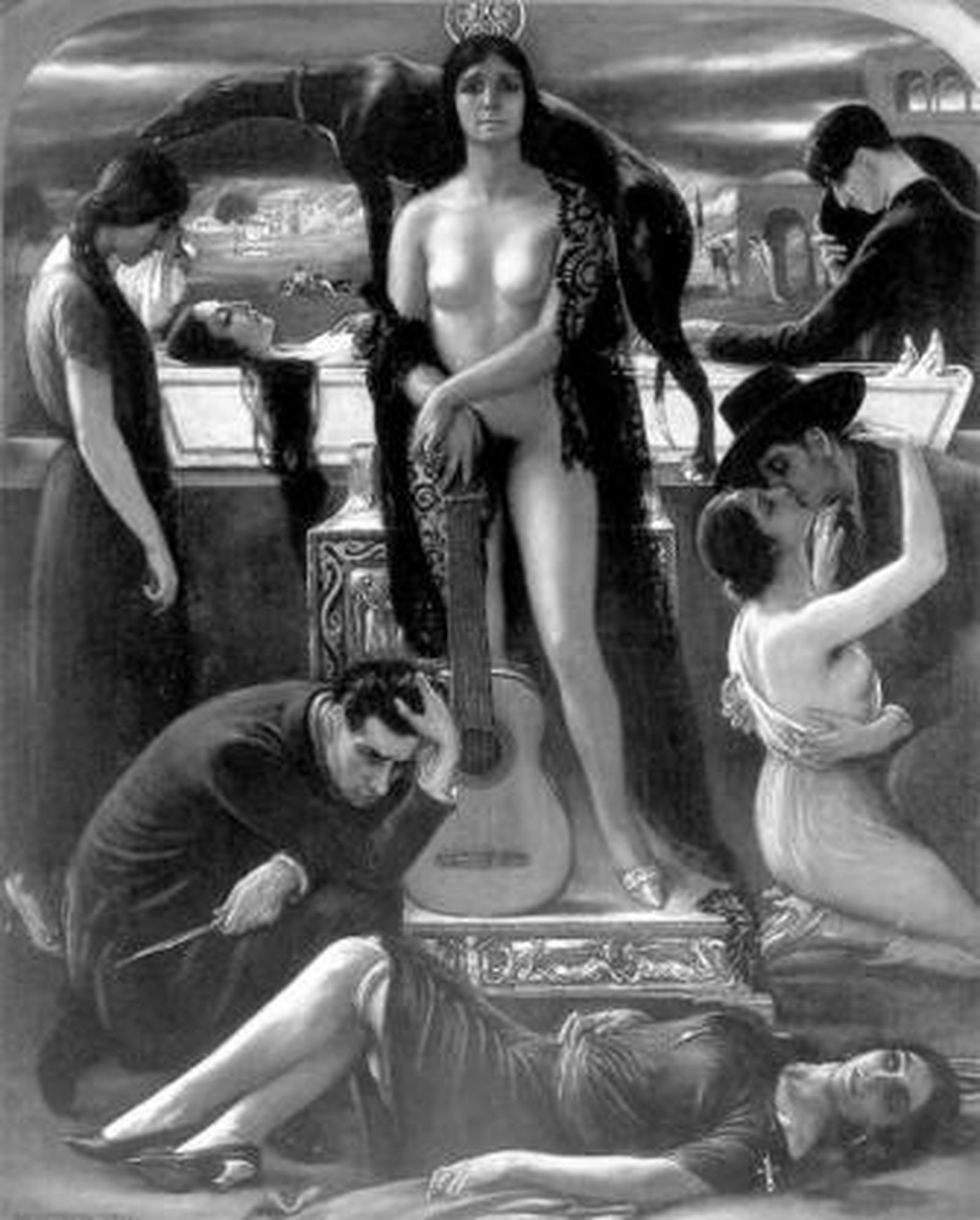 Cante Hondo es un óleo y temple sobre lienzo que tiene unas dimensiones de 168 por 141 centímetros. Romero de Torres ya se encuentra enfermo cuando acomete esta magistral obra. En ella vienen a confluir todas las claves de la pintura del maestro y del gran simbolista que fue. Esta equilibrada composición encierra las notas de la lírica popular andaluza. En torno a la figura central, mujer y símbolo de la fatalidad, giran todos los sentimientos y pasiones humanas: el amor, los celos y la muerte.