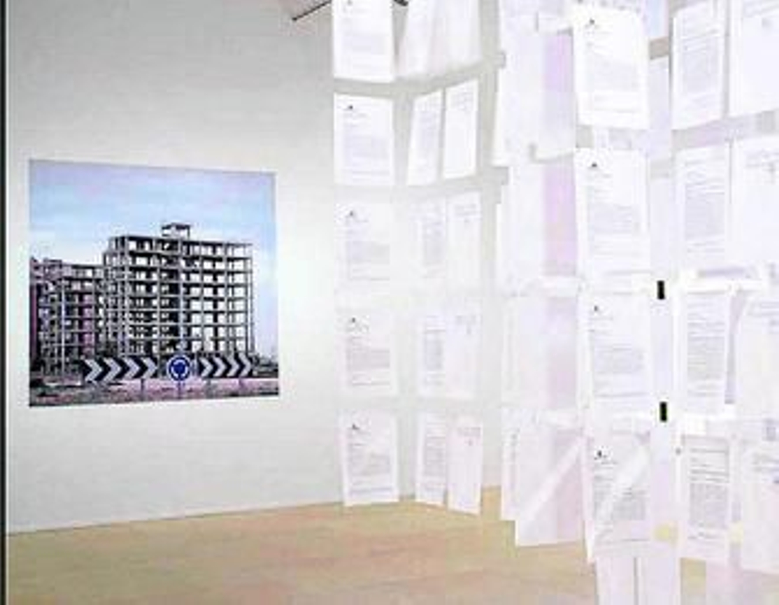 Completa la muestra una obra realizada este año en España en torno a una reciente operación inmobiliaria, el Ensanche de Vallecas. El proyecto reúne las arbitrariedades y abusos propios de la burbuja. Cooperativas que no son tales, financiaciones en cadena cuyos débitos recaen sobre un comprador que, tras haber pagado tiene aún deudas y no vivienda. A esto se unen las ruinas: esqueletos de hormigón, solares abandonados, locales aún en venta pero ya deteriorados. Las fotos del desastre alternan con fotocopias de documentos engañosos o de quejas sin respuesta. Todo ello frente a un vídeo que ofrece el panorama del desastre. En él se ven los nombres de las calles y ¡aquí aparece el arte!: calle del minimalismo, del arte pop, del conceptual. Todo muy moderno.