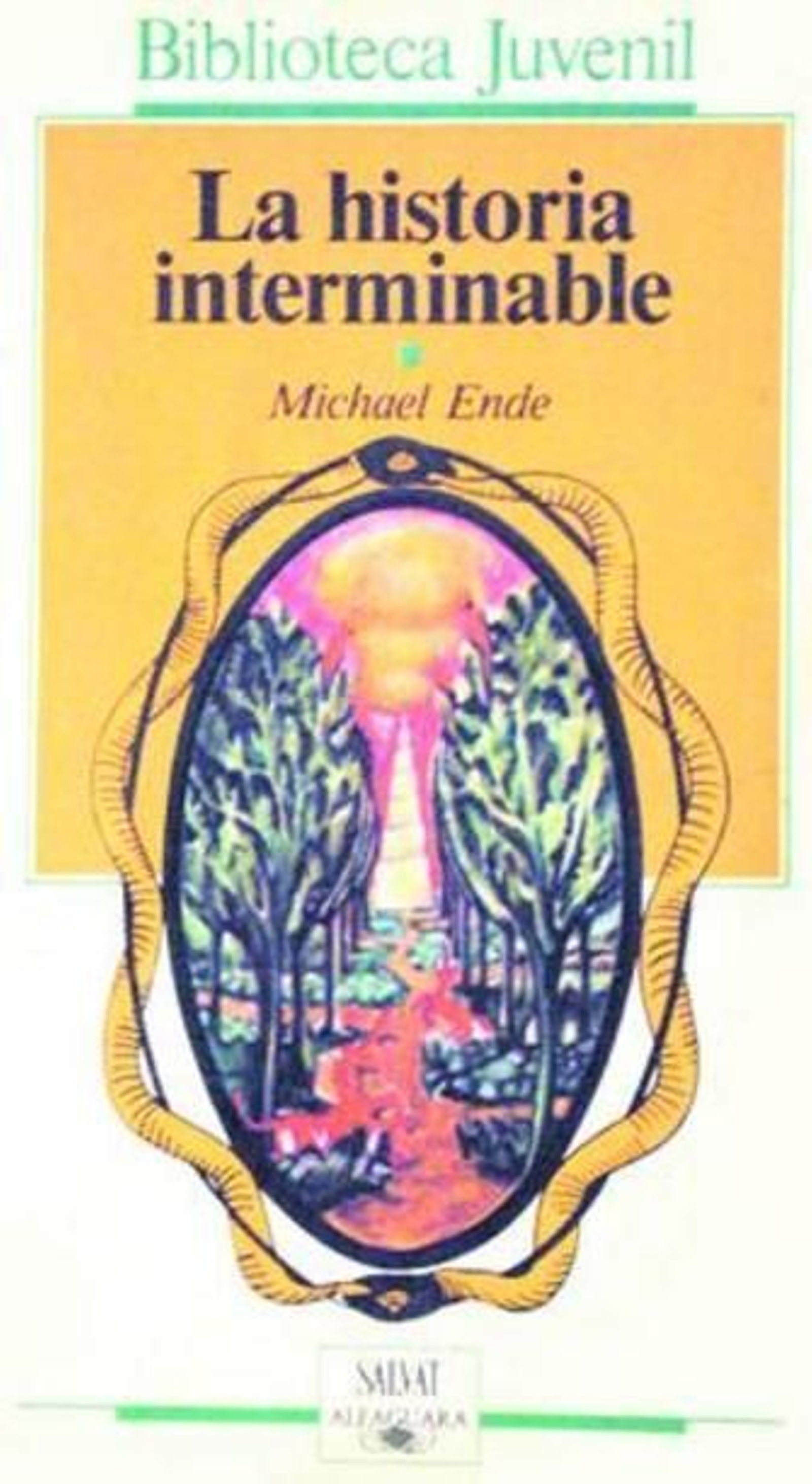 En la portada, dos serpientes se muerden la cola, ambas son naranjas con la cabeza negra, se supone que una de ellas tendría que ser blanca y la otra negra pues así describe Ende el Áuryn, como representación del mundo de Fantasia en donde lo oscuro y lo luminoso tienen su lugar a partes iguales. Dentro del óvalo formado por estas, un jardín de colores saturados habitado por dos unicornios muestra al fondo una versión sencilla de la torre de marfil donde reside la Emperatriz Infantil. Me parece preciosa, en su primera página reza con la letra enérgica e ingenua de mis ocho años: Ana Belén Ramos Guerrero, y bajo esta leyenda manuscrita, en letras impresas de molde verde: La historia interminable. Como recordarán trata de un niño regordete, Bastián Baltasar Bux, al que las cosas le van regular y que se encierra en el desván de su colegio con la intención de no salir nunca jamás, con la única compañía de un libro robado titulado La historia interminable. Maravillas del arte, Bastián se introduce en el propio libro convertido en un esbelto y hermoso guerrero que habrá de salvar el mundo de Fantasia. Si ha decido usted incluir el libro en su lista para los Reyes Magos, ha de saber que justo ahora se cumplen treinta años de la publicación de la novela y ochenta del nacimiento del autor. Es el libro ideal para los niños porque decididamente tiene todo lo que un niño le pide a los libros, a saber: acción trepidante, aventuras peligrosas, misterios por resolver, grandes dosis de amistad y fantasía, y monstruos y extraños animales por doquier: comerrocas, silfos nocturnos, trolls de tres cabezas..., además de dos protagonistas de unos diez años y una hermosa niña de cabellos blancos que reina en el mundo de Fantasia.