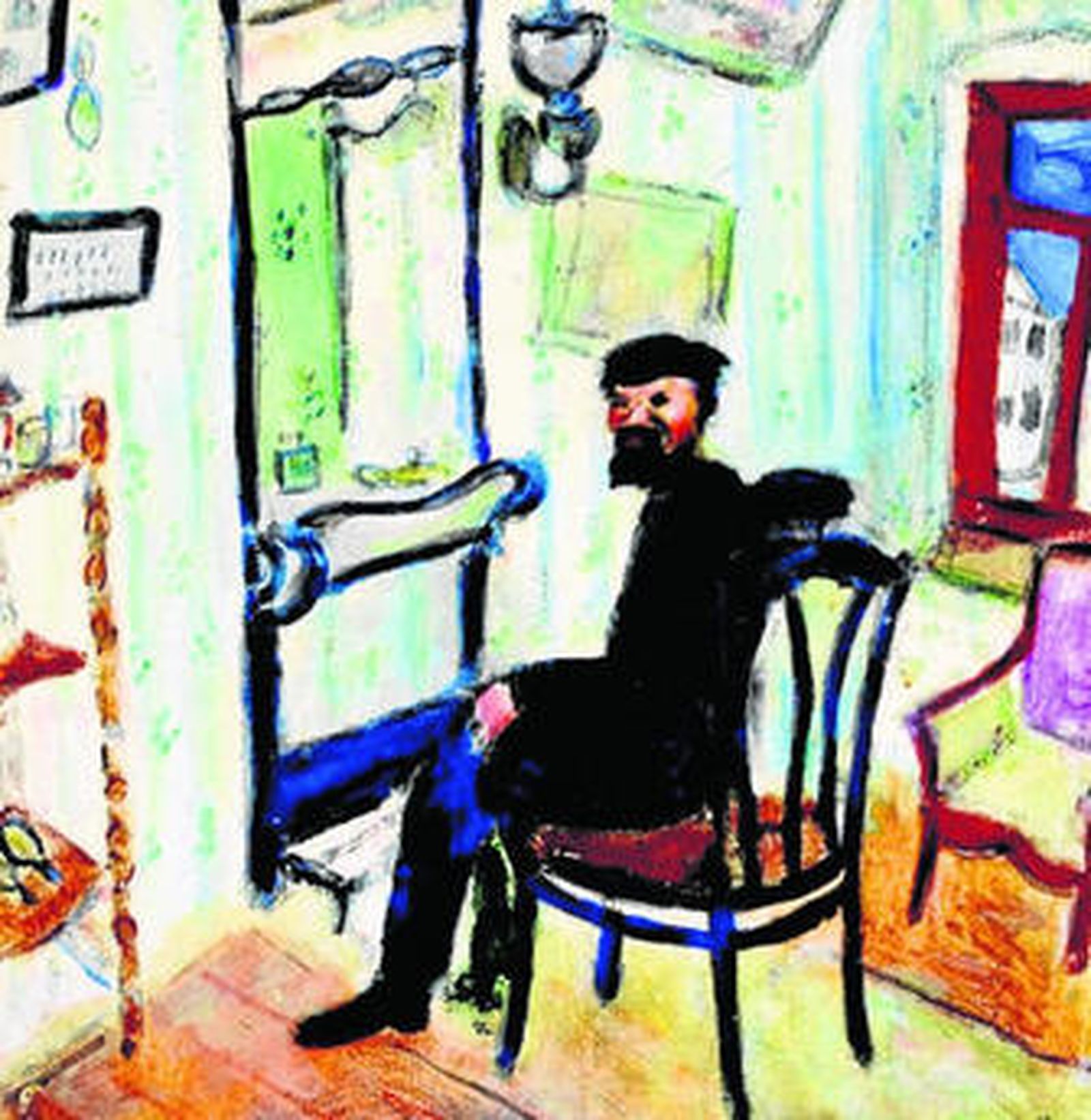 La mayoría de las dieciséis obras de Chagall incorporadas a la muestra son posteriores a 1914. Para entonces, el artista ya era un pintor respetado y cotizado en París, pero el estallido de la Primera Guerra Mundial le hizo volver a Vitebsk. Allí se casó, creó su propio hogar junto a la casa de sus padres y se dedicó a pintar estampas familiares y pintorescas, propias de la vida cotidiana en el pueblo. Así sucede en Tienda en Vitebsk (1914), en el que Chagall recrea la propia tienda de su padre, y en el que un personaje que abre una puerta en el extremo del lienzo "sugiere ya el principio de un cuento, de una narración; y es que todo en Chagall es relato y fantasía, tal y como se le reconoce, pero a la vez es mucho más", subrayó ayer Petrova. Las escenas familiares se suceden con Padre y abuela (1914), El patio del abuelo (1914) y Mariásenka. Retrato de la hermana del artista (1914; Mariásenka, por cierto, está representada también en otro cuadro anterior, de 1907); pero tampoco faltan los personajes comunes de Vitebsk, inmortalizados en Barrendero (1925), Soldados con panes (1914-1915) Viejo barbero (1914) y las dos representaciones de judíos: Judío en rojo (1914) y Día de fiesta (Rabino con limón) (c. 1925). En Los amantes azules (1914) comparece un Chagall ya pródigo en el dominio del color como trasunto de las pasiones, pero es en Paseo (1917) donde la ensoñación liberada en el centro de un mundo empeñado en destruirse alcanza el mayor fervor de la belleza. El mobiliario de una de las habitaciones de la casa familiar de Vitebsk, donada al Museo Ruso de San Petersburgo por las hermanas de Chagall hace veinte años, completa el proyecto expositivo (dando un tanto la razón a Kafka, por aquello de que todo hombre guarda una habitación dentro) con otros cuadros como el Autorretrato (1911) de Nathán Altman, Tía Sasha (1922-1923) de David Shtérenberg y Retrato de un desconocido (1918) de Róbert Falk. Y la memoria se complace.