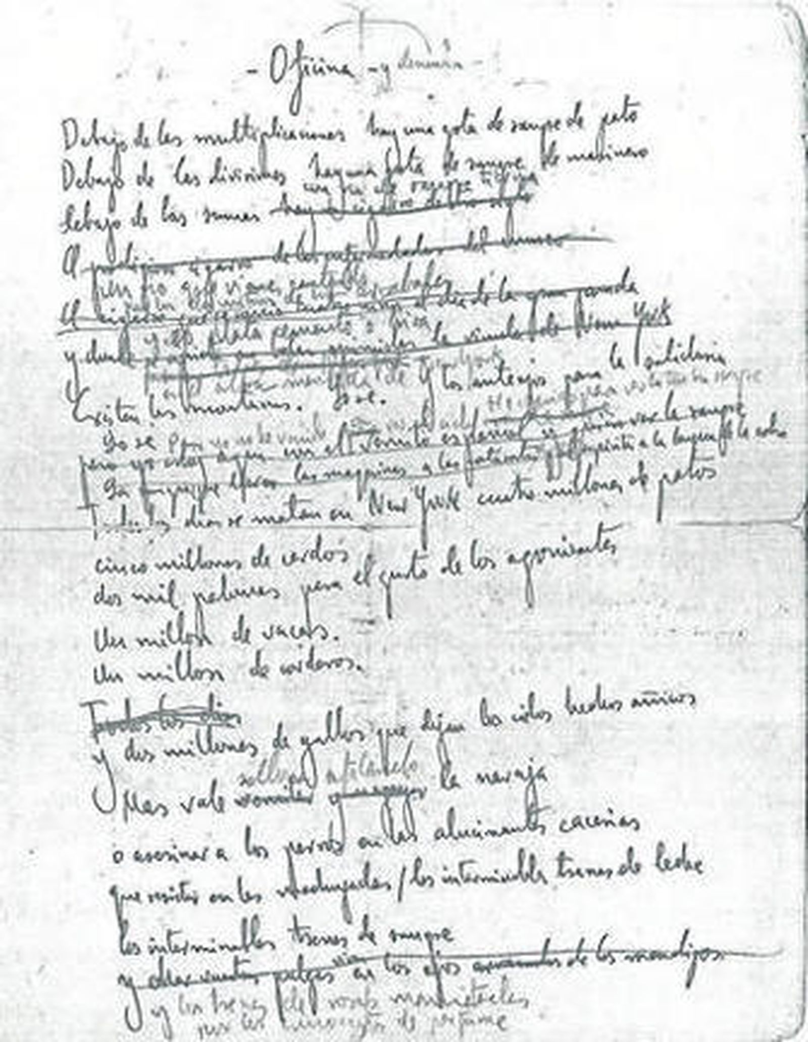 Donde Lorca dio por bueno finalmente ofrecerse "a ser comido por las vacas estrujadas", llegó a pasársele por la cabeza ofrecerse "a ser devorado por los campesinos españoles". Semejantes frases eran posibles, ambas, en el poema Oficina y denuncia de Poeta en Nueva York. No se sabe por qué -ni se sabrá-, Lorca decidió finalmente ofrecerse a las vacas y tachar aquella otra idea que fue la primigenia de los últimos versos del estremecedor poema donde habla de los excesos de la ciudad que nunca duerme. Andrew A. Anderson y Christopher Maurer trabajan desde hace tiempo en el libro biográfico Federico García Lorca en Nueva York y Cuba: Cartas y recuerdos, una obra que reúne documentación inédita del poeta y que publicarán con ocasión de la apertura del Centro Federico García Lorca en Granada. Cuenta Maurer que un día "buscando no sé qué cosa de García Lorca en la Red, vi con gran sorpresa que había un manuscrito suyo, de Poeta en Nueva York, en la Biblioteca del Congreso de Washington". Se trataba de uno de los autógrafos que faltaban del manuscrito de Poeta en Nueva York, tres folios escritos a lápiz por Lorca y con múltiples tachones que, aunque desconocidos hasta ahora, poseen la misma riqueza que los restos que finalmente vieron la luz.