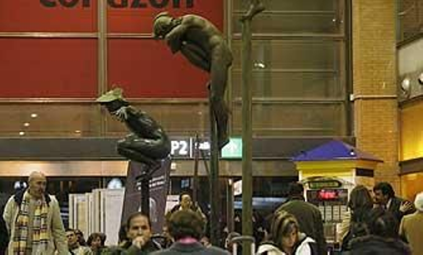 Entre la confusión y las prisas de los viajeros de la estación del AVE, y abrigos y maletas rodando de un lado a otro, aparecen 15 cuerpos desnudos que se alzan sobre finos pedestales, casi imperceptibles, que elevan las figuras hiperrealistas hacia el cielo. Se trata de una quincena de estatuas realizadas con resina de poliéster distribuidas por el recinto y dando la bienvenida a los cientos de viajeros que cada día pasan por ella y a los viandantes que deambulan por su interior.