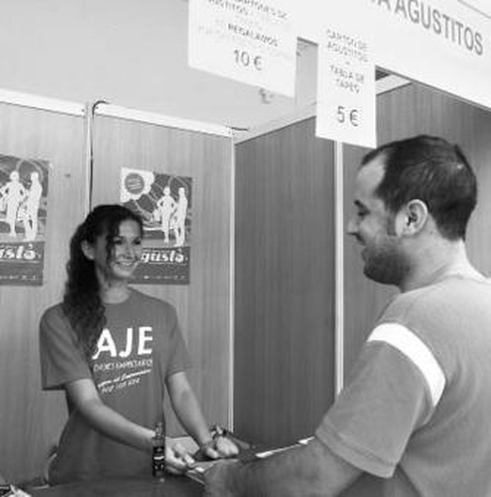 El técnico de orientación laboral suple durante unos minutos a Fabiola, una chica que en la feria regenta uno de los stands en los que se venden esos cartones canjeables por consumiciones. "Señora, por cinco euros tiene derecho a ocho degustaciones o agustitos más una tabla de tapeo y una botellita de aceite. También tiene la posibilidad de comprar dos cartones, con los que además le regalaremos una camiseta", le detalla.