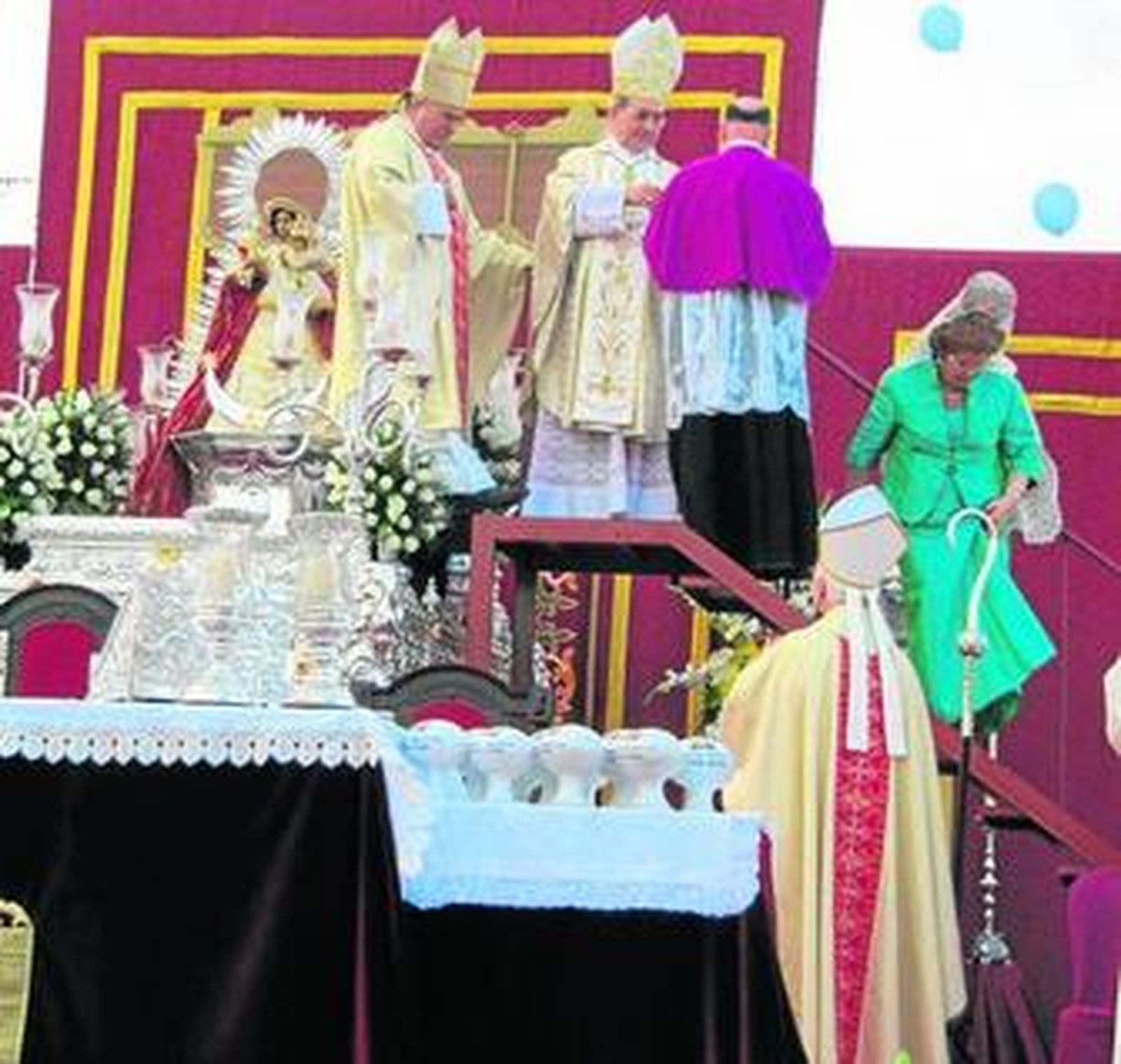 Desde allí, partió la patrona hasta el recinto de la Coronación, la Mesa de San Pedro, donde se congregaron unas 6.000 personas deseosas de ser testigos de este acto de fe. La emotiva eucaristía pontifical de Coronación, que estuvo presidida por el arzobispo de Sevilla, Juan José Asenjo Pelegrina, y contó con la presencia del obispo de Córdoba, Demetrio Fernández, se prolongó durante dos horas.