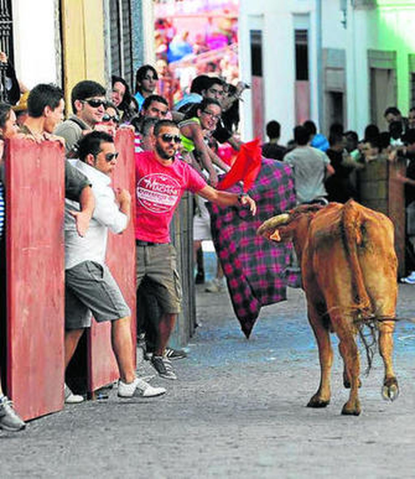 Por la tarde se celebró una novillada. De hecho, el toro le imprime a esta celebración un carácter especial que la distingue del resto de festividades de la comarca. Junto al animal, taurinos de raigambre y aficionados en general viven la fiesta de formas muy diferentes. Algunos, los más puristas, madrugan y preparan el encierro desde mucho antes de que el primer cohete anuncie la inminente salida de las vacas. Las peñas también se hacen notar. La bebida no falta en un día caluroso. Dentro y fuera de los bares hay gente que espera la salida de los toros. Momentos más tarde, incluso algunos de estos establecimientos servirá de refugio para que los corredores eviten las embestidas de los astados.