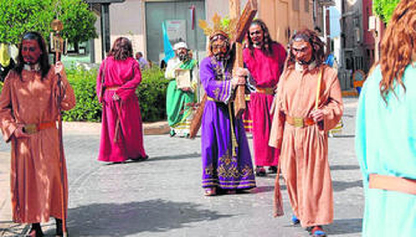 En torno al mediodía, comenzaron a incorporarse al desfile las cerca de 450 figuras bíblicas que representan diversos pasajes del Antiguo y el Nuevo Testamento, personajes ataviados con ropajes de la época que dan un sello propio a la Semana Santa pontanesa y que constituyeron uno de los grandes alicientes turísticos de la jornada. Además, la presencia en las calles del más de centenar de componentes de la Corporación del Imperio Romano dio un plus de vistosidad a un recorrido que tomó el formato actual a mediados del siglo pasado y que se ha convertido en completamente imprescindible para todos aquellos que quieren conocer un poco mejor una de las tradiciones más arraigadas de la ciudad.