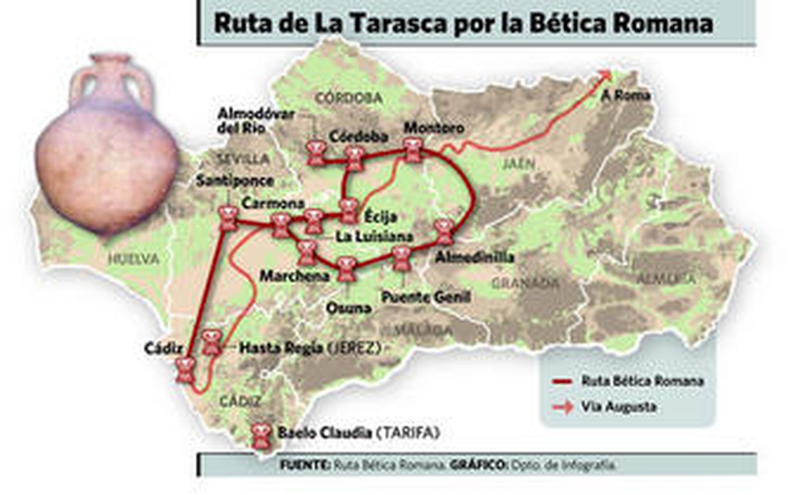 La Vía Augusta, calzada que en tiempos de la Hispania romana conectaba la Bética con la capital italiana, se convertirá desde el próximo 13 de agosto y durante un año en el escenario sobre el que la compañía de teatro La Tarasca representará su obra Genius loci, caravana hacia Gades. Una creación de carácter especial, tanto por su forma como por su contenido, que pretende dejar huella en los 14 municipios que componen la Ruta Bética Romana, usando para ello la cultura como principal herramienta de difusión y conservación del importante legado patrimonial que albergan cada uno de estos puntos de la ruta.