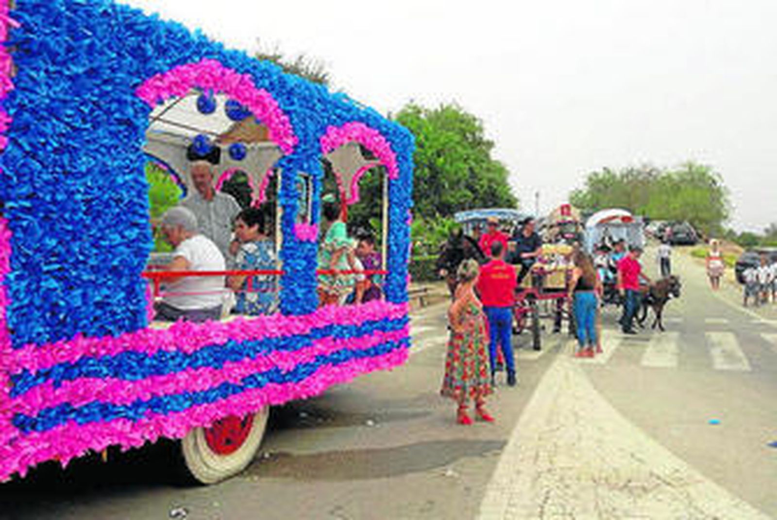 Ya por la tarde, en la margen derecha del río Guadalquivir se vivieron de diferentes maneras las horas previas a la salida de la imagen mariana. Nada más cruzar el antiguo puente de hierro, a las faldas del templo aguardaron varias carrozas y caballistas con las miras puestas en acompañar una vez más a su titular. Muchos jóvenes también se concentraron en las zonas verdes del recinto para celebrar este día entre amigos, al igual que algunos vecinos vestidos para la ocasión -de corto y de flamenca- acortaban la espera mediante cantes y bailes.