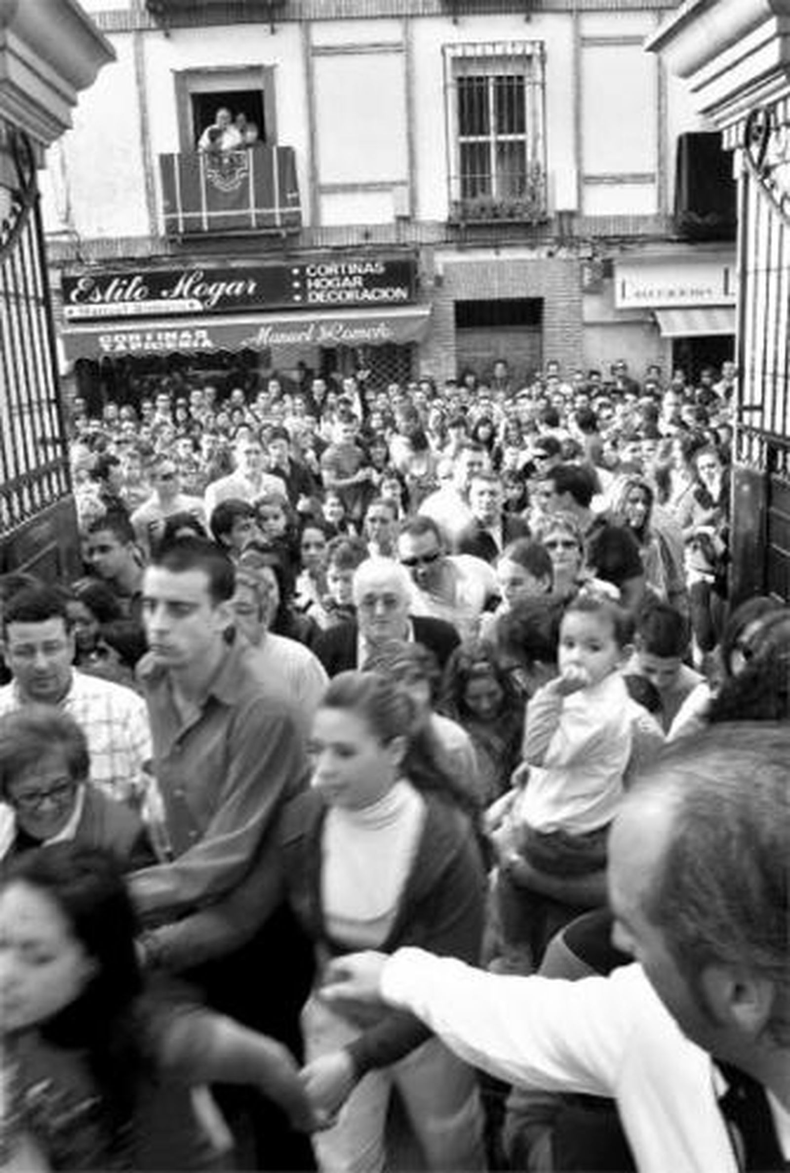 Desde allí hay que aguantar de puntillas, colocar la mirada entre quienes sí han logrado su hueco sobre la verja y ver salir los pasos entre piernas y barrotes de hierro. A las cinco se abre el portón y, después de que se cumpla este protocolo, puede que se plasme otro rito, ese que dice que el viento empuja nubes sobre los Salesianos cada tarde de Martes Santo. "Otra vez no", pide un vecino que no quiere que los pasos se queden en la iglesia, como ocurrió el año pasado a causa de la amenaza de lluvia.