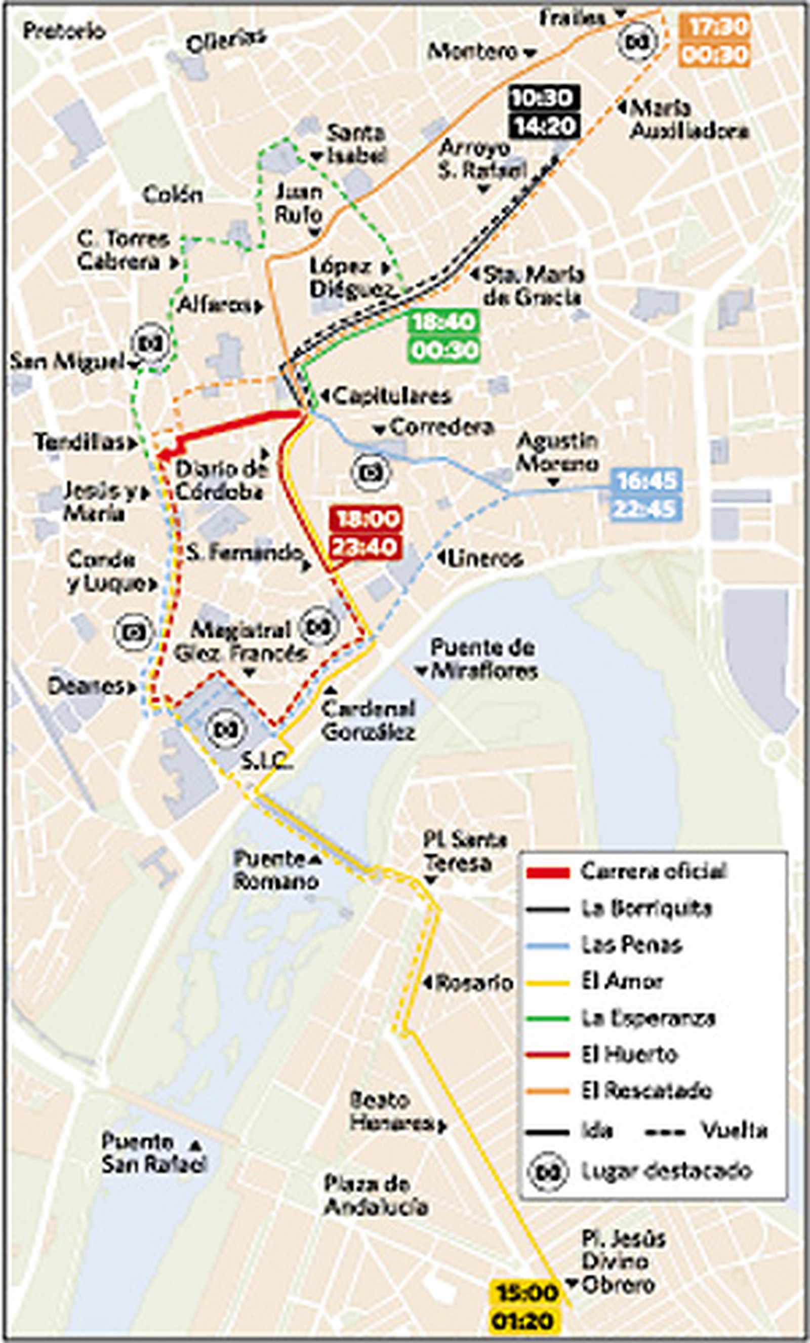 Itinerario: Parroquia de Jesús Divino Obrero. 15.00 Jesús Divino Obrero. 15.30 Beato Henares. 16.00 Beato Henares. 16.30 Plaza de Santa Teresa. 17.00 Puente Romano. 17.30 Torrijos. 18.00 Interior de la Catedral. 18.30 Interior de la Catedral. 19.00 Magistral González Francés. 19.30 Cardenal González. 20.00 San Fernando. 20.36 ENTRADA EN CARRERA OFICIAL. 21.11 SALIDA DE CARRERA OFICIAL. 21.30 Ángel de Saavedra. 22.00 Conde y Luque. 22.30 Judería. 23.00 Triunfo. 23.30 Puente Romano. 00.00 Plaza de Santa Teresa. 00.30 Beato Henares. 01.00 Beato Henares. 01.20 Entrada en el templo.