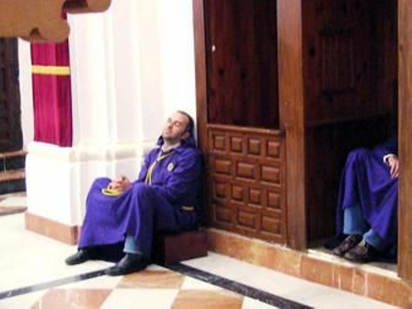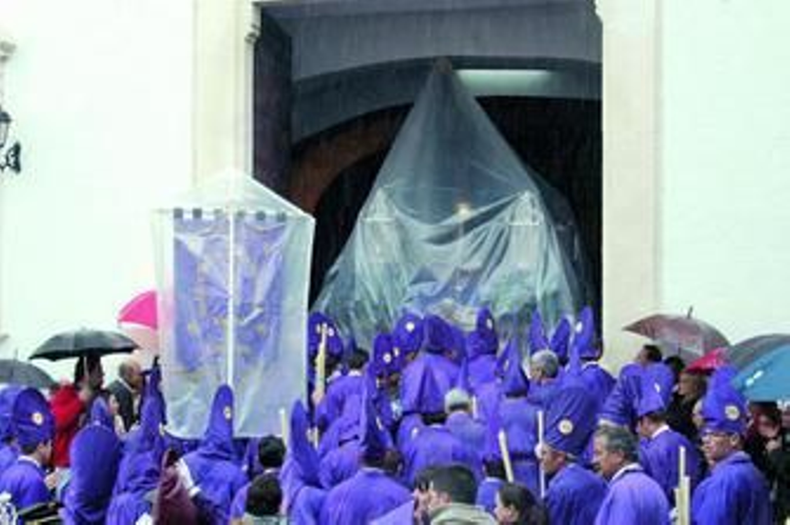 El Señor de La Rambla no pudo finalizar su estación penitencia debido a la lluvia. Sobre las 09:00 y cuando los nazarenos estaban encaraban la calle Ancha fue cuando las primeras gotas de agua caían sobre un suelo marcado por la cera morada de los nazarenos. La parroquia de la Asunción se quedaba pequeña en ese momento. Todos los nazarenos volvieron al templo. La hermandad decidió aplazar la salida una hora. Los nazarenos esperaban con incertidumbre y mirando de reojo que pasaría; algunos se dormían. Tras horas de espera, la Hermandad decide suspender la procesión y trasladarlo a hoy sábado a partir de las 09:00. / GABI PÁEZ