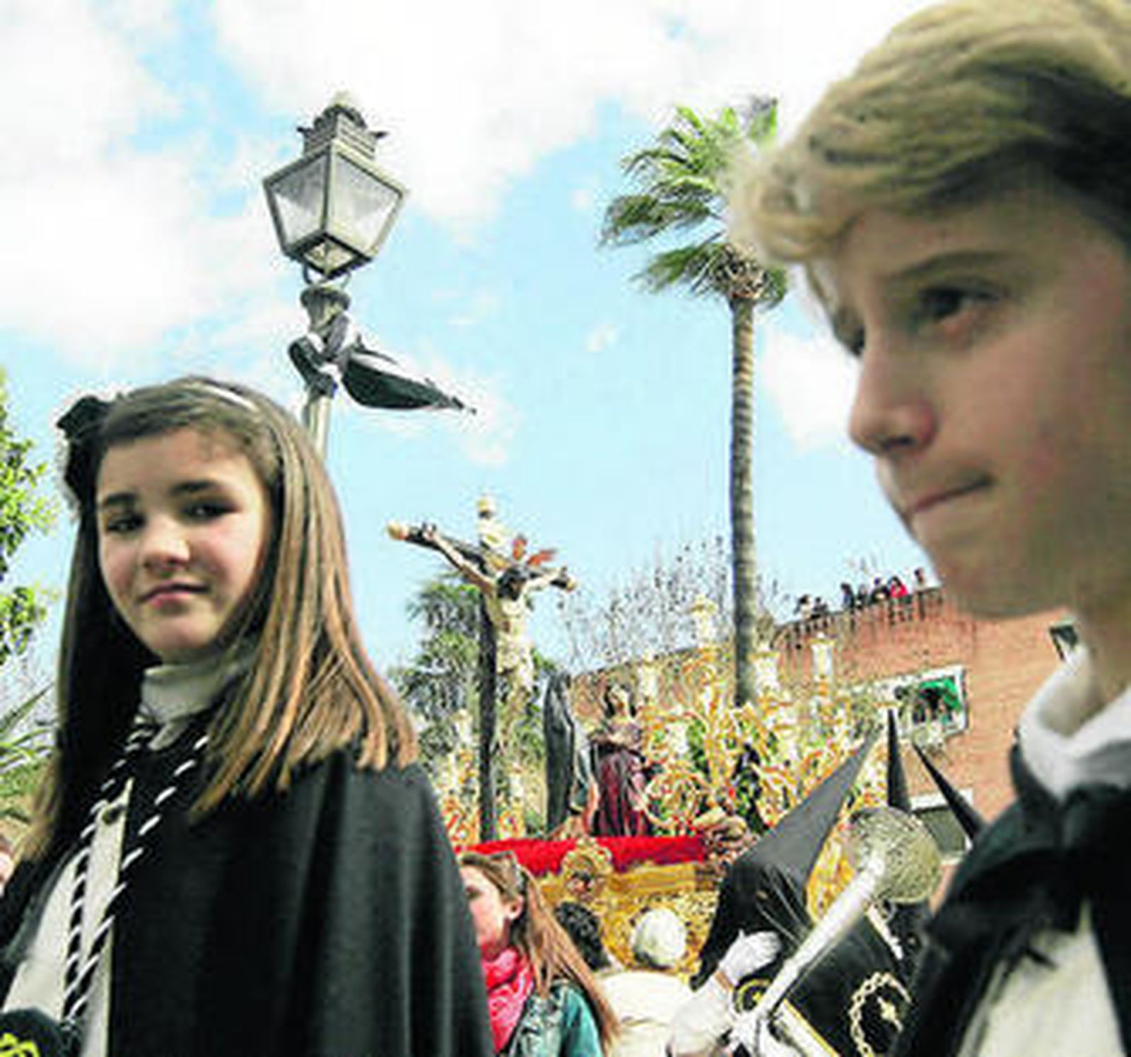 El repicar de las campanas de la iglesia, a las 15:00, anunciaba puntual el inicio del ritual: un nazareno golpea tres veces el portón de la iglesia y, en un instante, dos hileras de nazarenos enfilan la plaza Cristo del Amor. Los chiquillos del barrio se arremolinan en la escalinata de la iglesia prestos a darle forma a las bolas de cera, y los vecinos animan a los costaleros y a los penitentes, la mayoría conocidos.