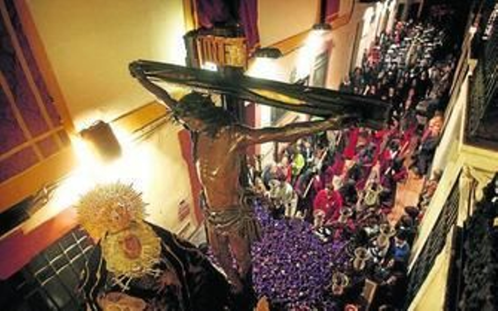 A paso lento, el Cristo de las Penas sale de su templo. El cortejo nazareno -de negro y rojo- comienza a abrirse paso para llegar a San Pedro. Tal y como auguraban los peores pronóticos, las primeras gotas mojan el suelo. "No abras el paraguas", le pide una joven a su amiga. Todos contienen la respiración, pero los costaleros, sin temor, conducen a su Cristo a hombros, dirección a la Corredera, marcados por el son de la Saeta. "Sabía que este año nada nos iba a impedir ver a nuestro Cristo de las Penas", dice una devota emocionada.