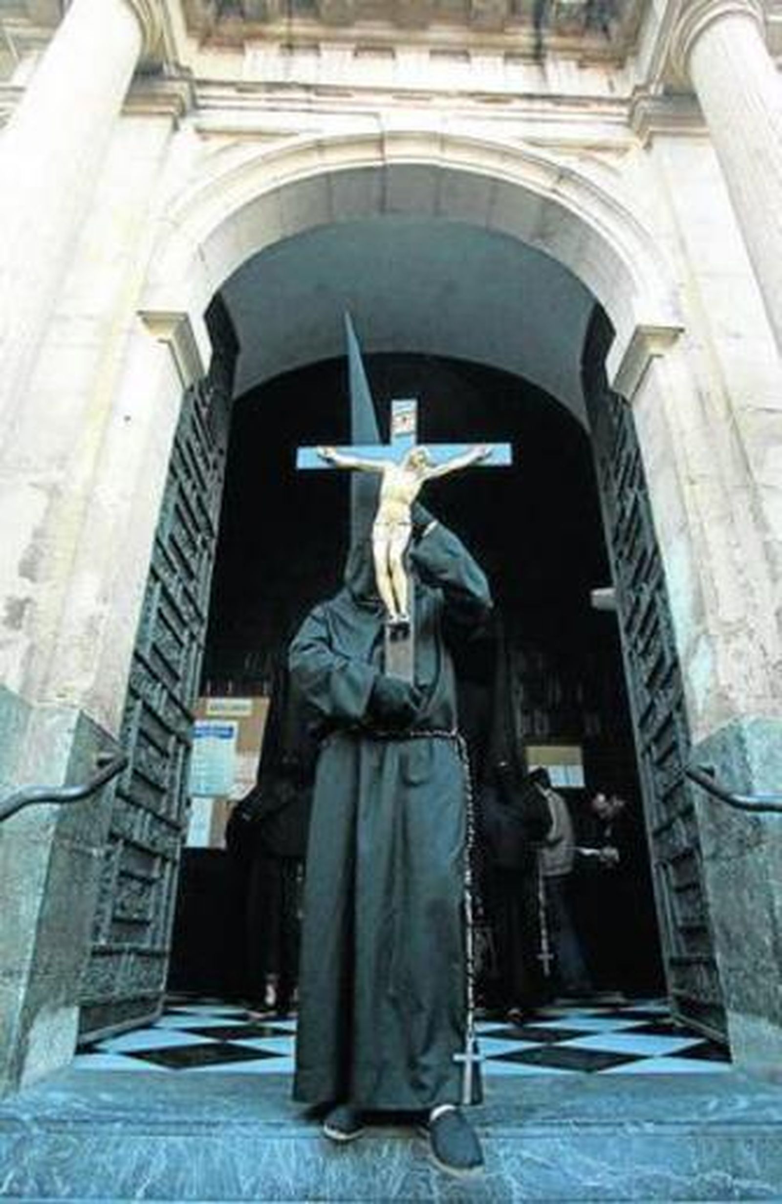 La primera estación, la de Jesús condenado a muerte, la realiza el párroco de la iglesia de la Trinidad en la misma puerta del templo. La plaza se convierte así, de forma improvisada, en filas y más filas de bancos invisibles en la que los asistentes rezan el Vía Crucis junto a la hermandad del mismo nombre para dar la salida al recorrido del Crucificado.