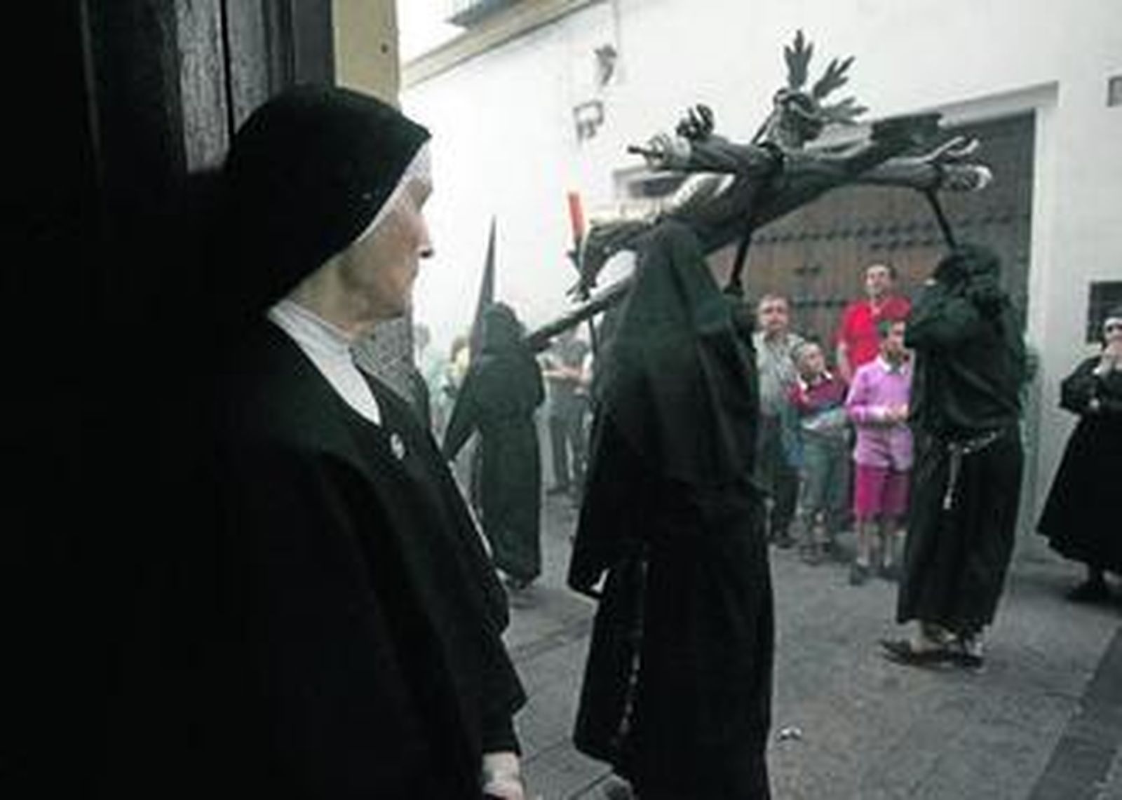 Es la solemnidad hecha cofradía y un año más lo volvió a demostrar. Abren el cortejo cuatro tambores roncos y enlutados que marcan los pasos lentos de unos nazarenos que llevan grabada la estación de penitencia. El negro les da el sentido de luto por el Cristo que llevan a hombros, un Cristo muerto en la cruz al que rezan y dedican cada estación de este Vía Crucis, única talla de toda la Semana Santa de Córdoba que no lleva paso.