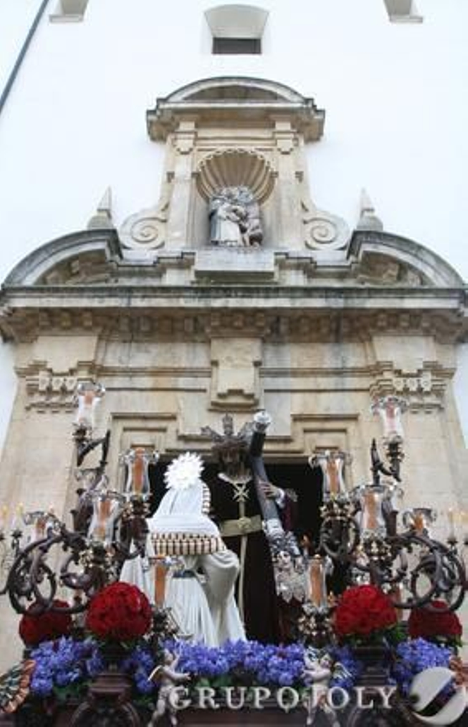 Y entonces el paso caoba y plata del Nazareno se asoma al dintel de piedra de la parroquia, una estrecha brecha en penumbras por la que apenas cabe el misterio. El hermano mayor y capataz, Rafael Soto, da las instrucciones. La multitud calla y observa el leve movimiento del paso, cada instante de su recorrido a pocos centímetros de la piedra que hiere. Asoman jarros de rosas granates y candelabros que se enroscan contra el cielo inquietante. "Izquierda, adelante", indica la voz tras dar un toque con un martillo de plata. Nuestro Padre Jesús Nazareno alarga su mano derecha hacia Santa Verónica, en un gesto de agradecimiento por limpiar su rostro; la otra mano abraza el madero oscuro de la cruz trinitaria mientras las campanas de la parroquia festejan la salida del cortejo.