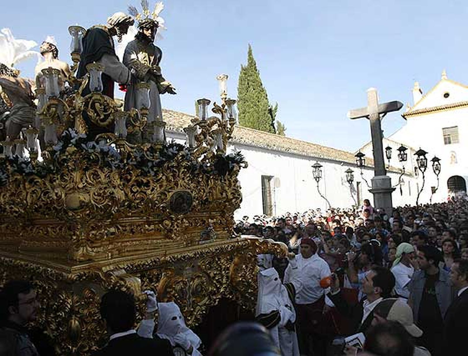 Por fin. El diputado de horas cumple con su función y da los tres preceptivos golpes con la vara, no con la mano. Poco a poco, los nazarenos salen, poco a poco toman parte de Capuchinos. Algunos llevan rosarios, otros van descalzos. La Agrupación Musical Santo Tomás de Villanueva, de Ciudad Real, con su uniforme de gala antiguo de la Guardia Civil toca la primera marcha sin que salgo el paso de misterio. Hasta que por fin se puede ver. “Con paciencia por Córdoba. Humildad al cielo”, dice el capataz del paso. El costalero anterior se vuelve y pregunta: “¿A qué es grande el paso?”. Aplausos y aplausos a cada paso que dan los costaleros.