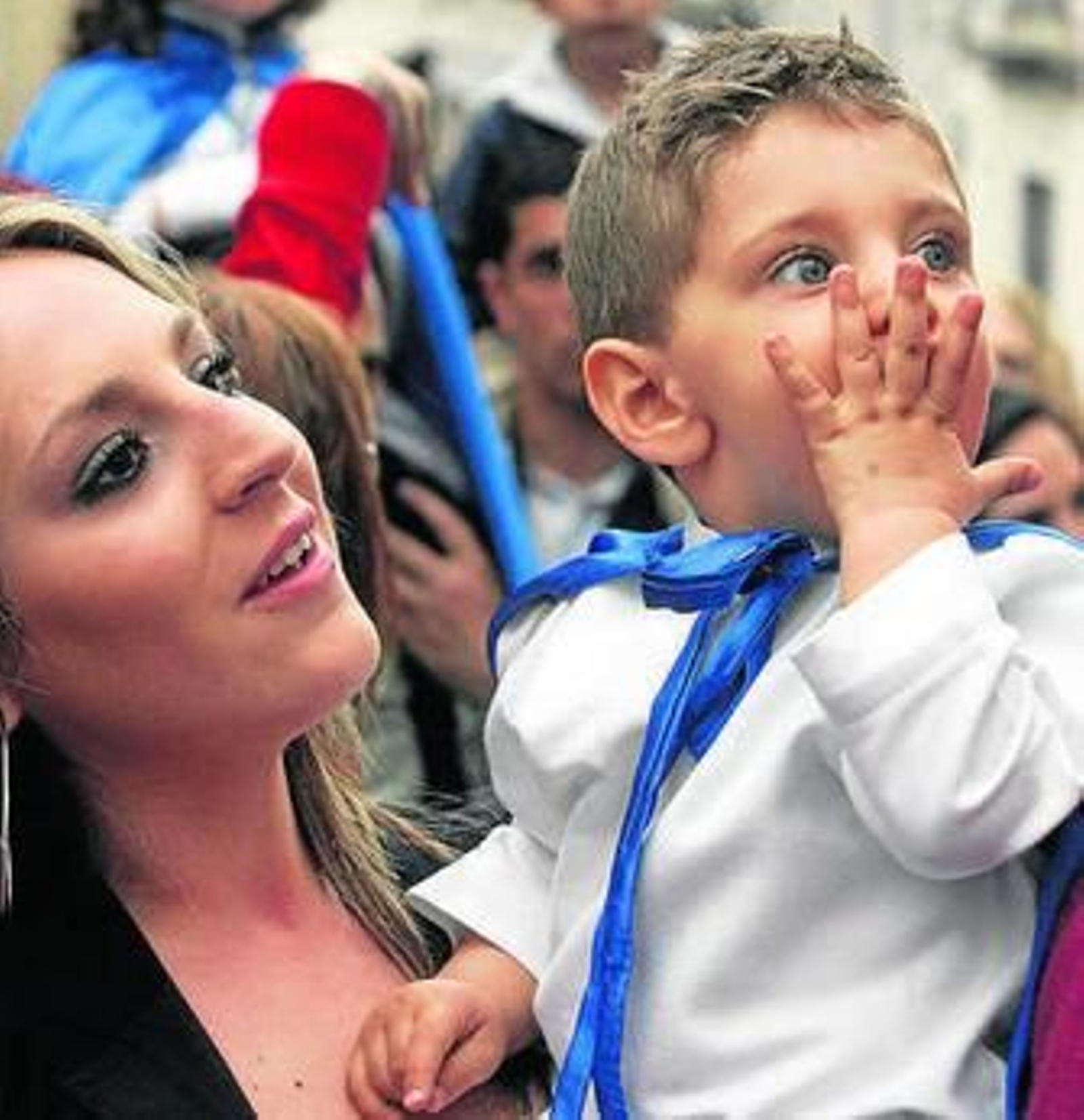 En pocos segundos, quedaron formadas las hileras de los penitentes en el patio salesiano, mientras los costaleros recibían las últimas consignas antes de meterse debajo del paso. Los más pequeños del cortejo, ataviados con túnicas azules y portando cestos de caramelos, tardaron poco en rociar las golosinas por el suelo.